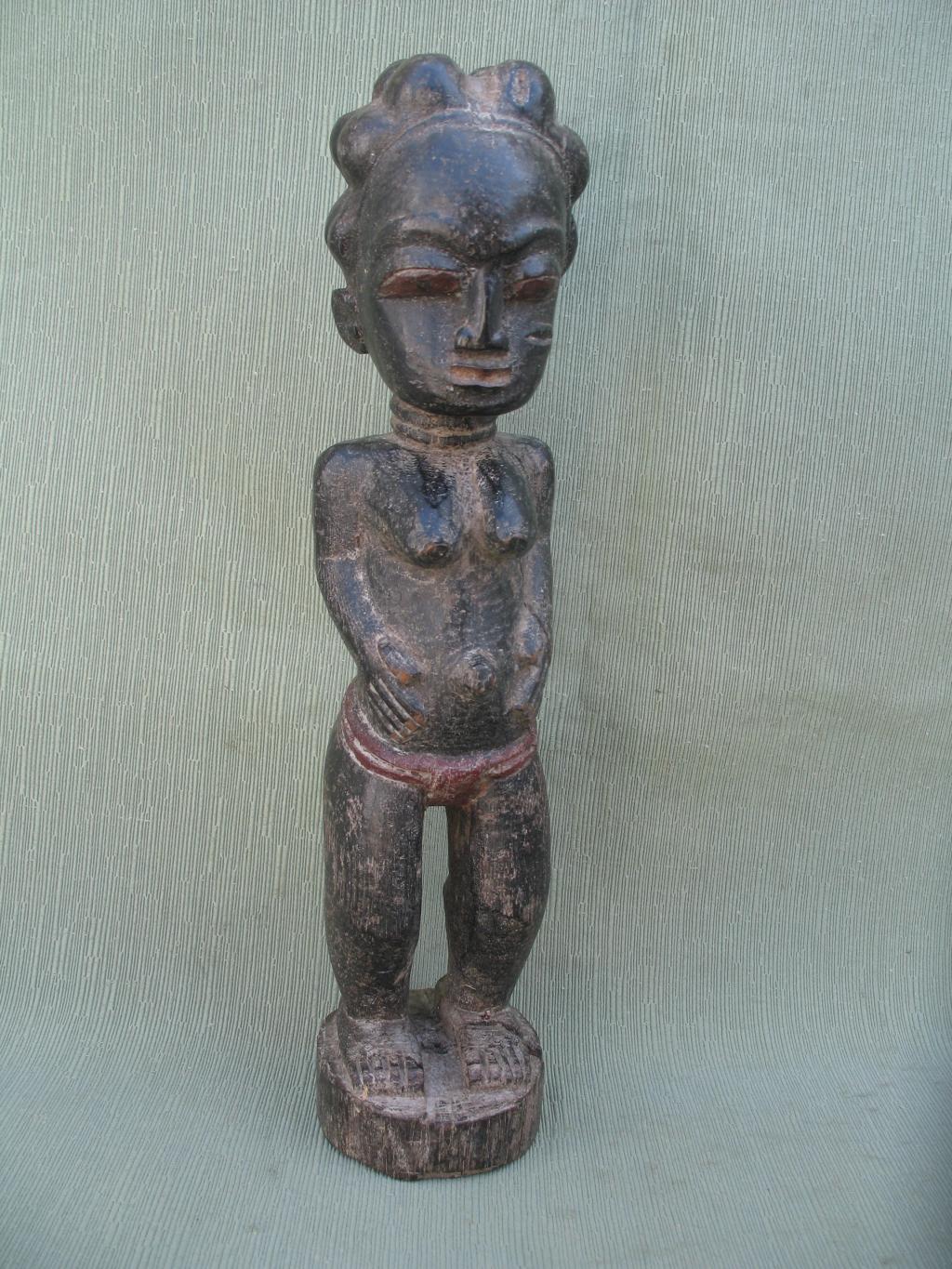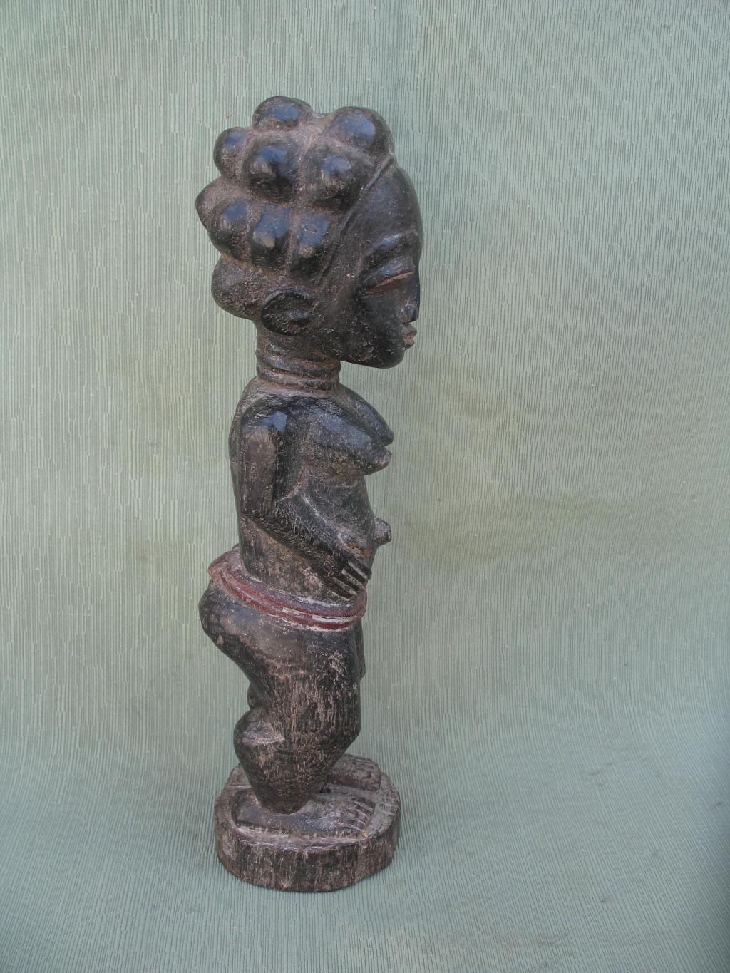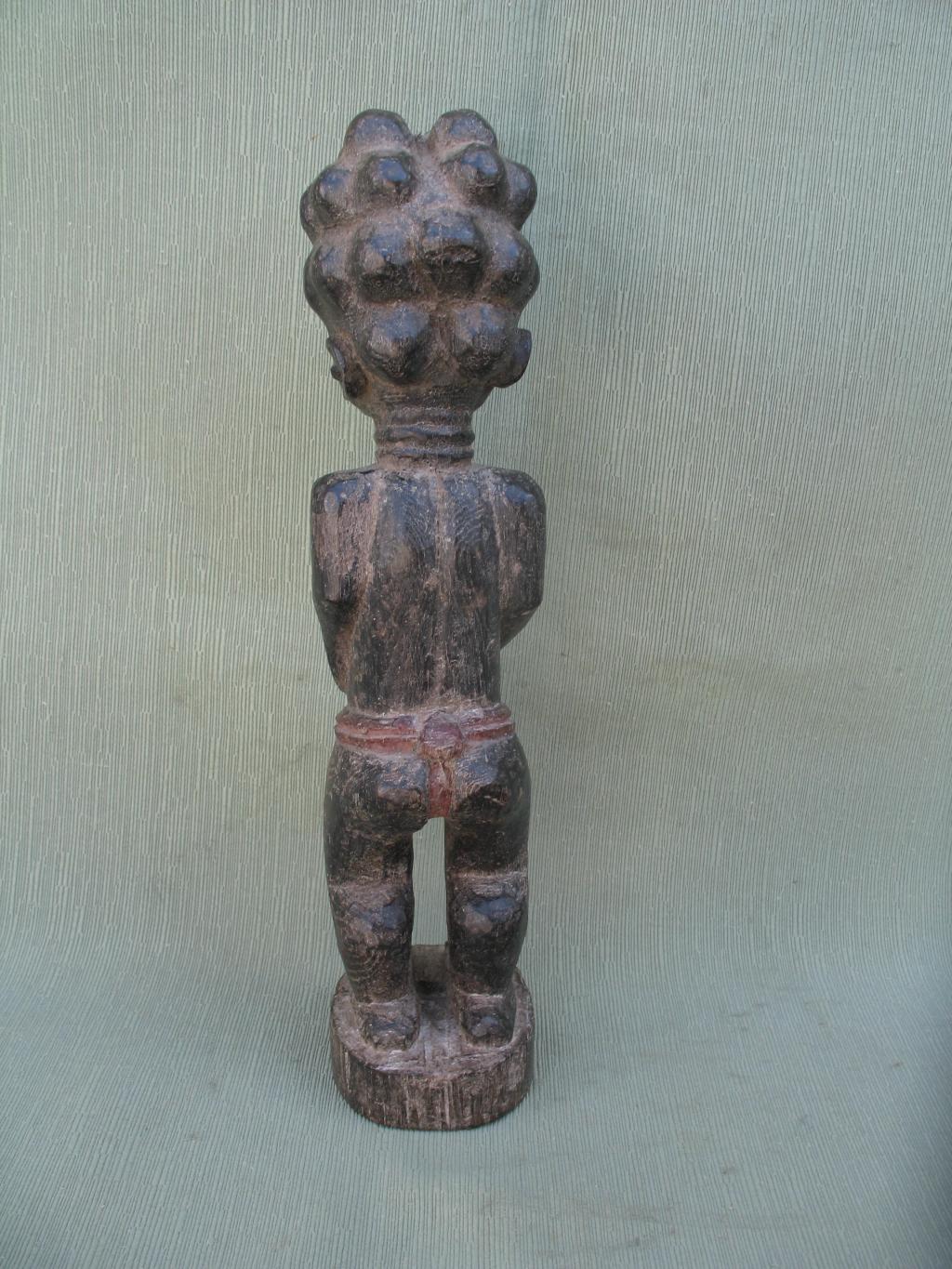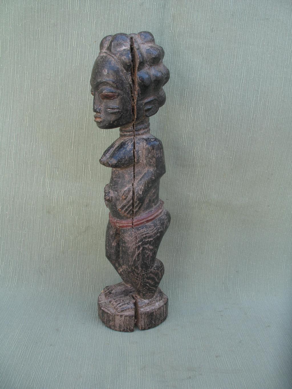 Joven iniciada como lo demuestra su escarificación facial. Cuelo aniollado y peinado de bucles característicos de la etnia.Porta un pequeño cubresexo rojo anudado en la parte trasera. Sus manos colocadas en el vientre, en expresión de paz, postura clásica de muchas etnias africanas. Fisura en un costado debida al cambio de clima y a su antiguedad. Pátina negra.