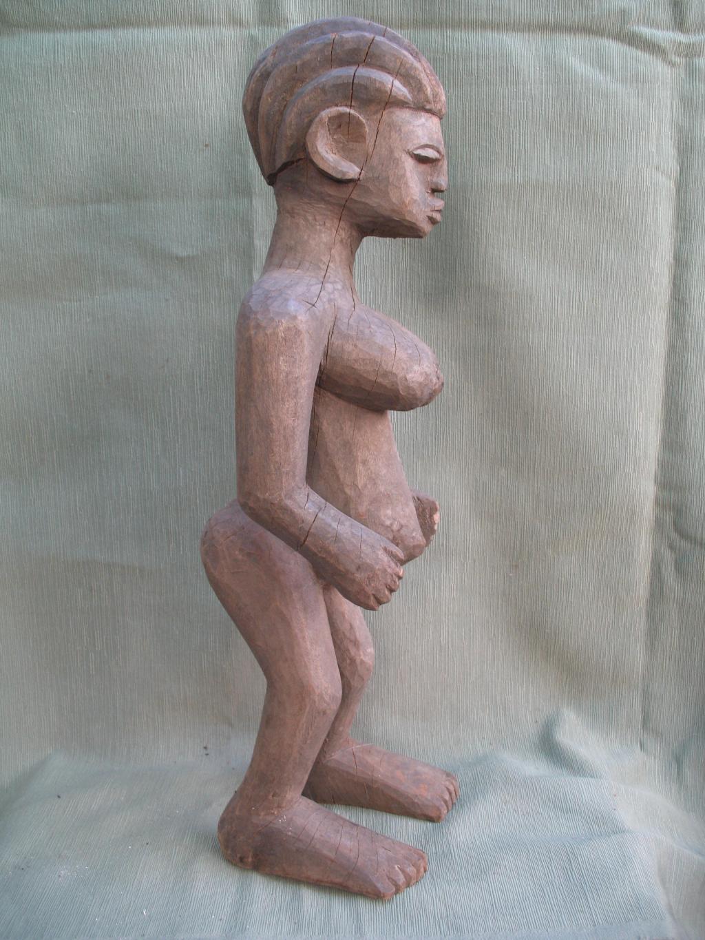 Figura de antepasada lobi que rompe el clásico molde de las figuras "bateba". La mujer representada oferce un gran realismo con una expresión de tristeza, recogimiento y dulzura. Piernas y brazos lígeramente abiertos, separados, como en una actitud de espera. Pechos generosos y vientre abultado que indican que se trata de una maternidad. Formas redondeadas. cabello estriado a base de surcos paralelos. Algunas fisuras debidas a la edad. Pátina antigua.