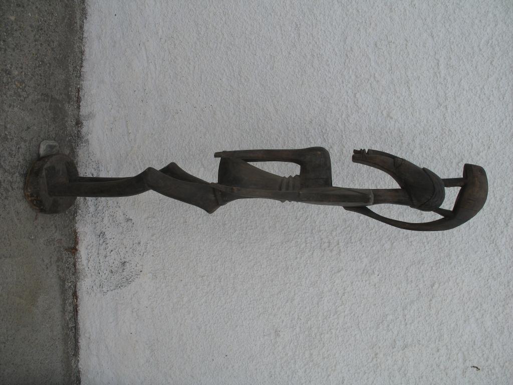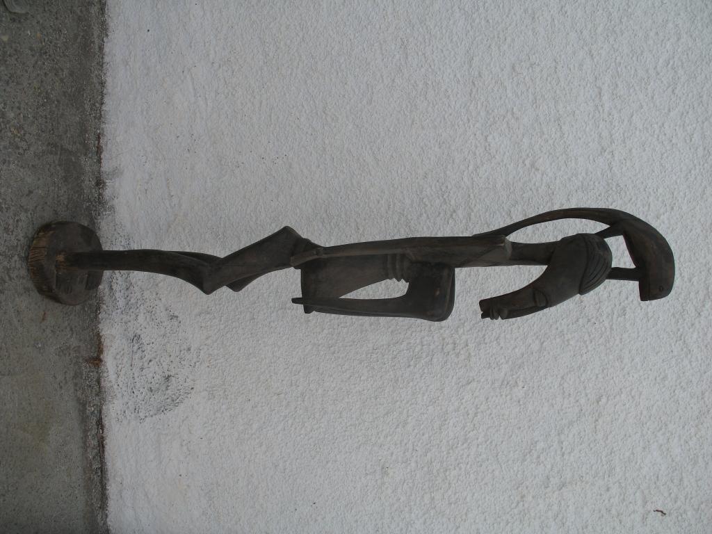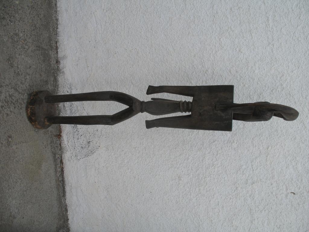 Estatua de mujer de extremada delgadez que presenta varias pariticularidades. Ademas de "pombibele" puede ser considerada maternidad dado su abultado vientre y sus pechos caídos. Las imágenes que reúnen estas características son consideradas maternidades en la estatuaria africana. Sus hombros cuadrados, su larga cabeza y sus largos pechos que forman ángulo recto así como los tres anillos debajo de los pechos son elementos atípicos en este tipo de estatuas. Sobre la cabeza aparece uno de los animales sagrados de los senufo, el camaleón, uno de los cinco primeros animales en existir en la tierra y símbolo de sabiduría pues es capaz de adaptarse a cualquier circunstancia. Pátina oscura.