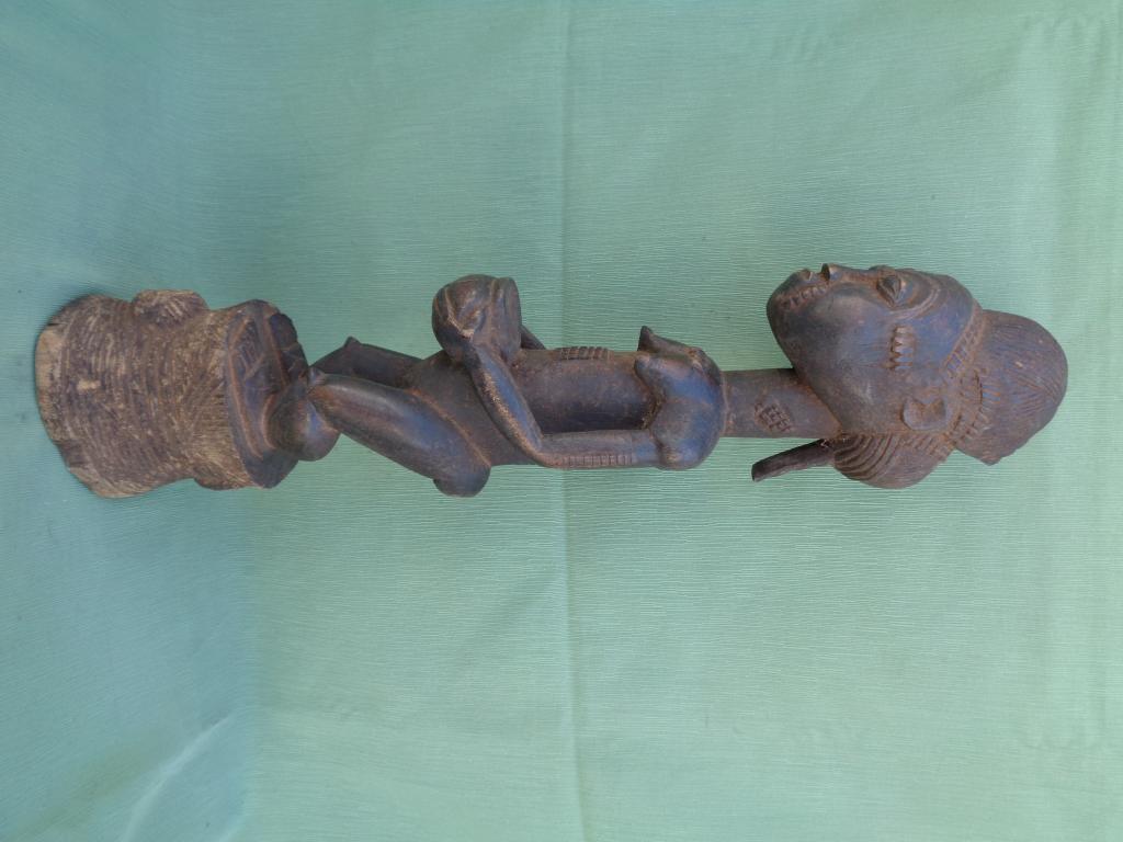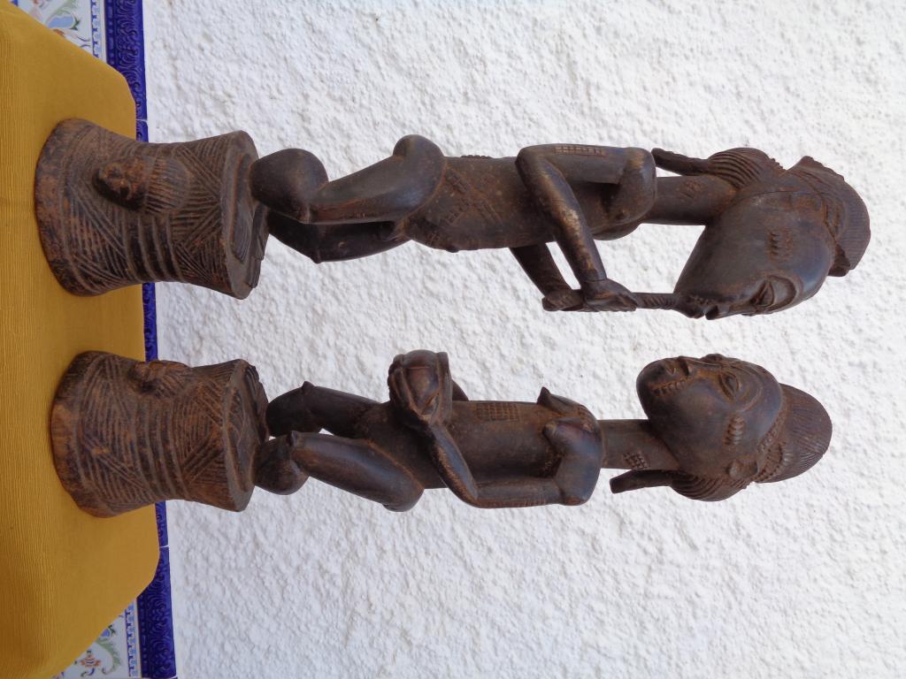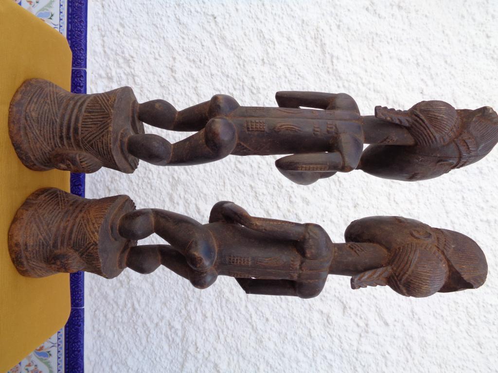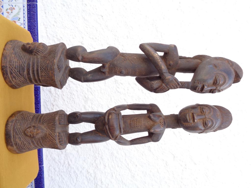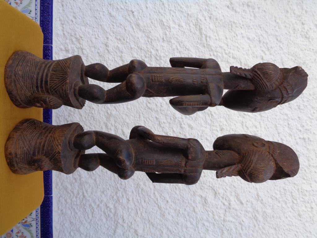 Mujer notable e iniciada que lleva en sus manos una copa de ofrendas. Su estética responde al más puro estilo baulé. Forma parte de una pareja.- Pátina negra.