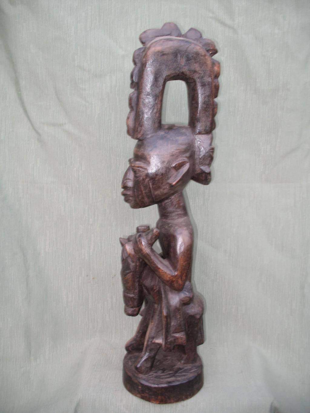 Esta figura ecuestra personifica a Obatala en su montura, un antepasado de los Yoruba deificado que también recibe el nombre de “Jagunjagun”. Representado con frecuencia como un cazador armado de fúsil o de lanza. Obatala es una de las 16 divinidades secundarias encargadas por Olorun, dios del Cielo, de crear el mundo y de introducir la vida en él. LLeva un tocado de ceremonia. Pátina oscura, casi negra.
