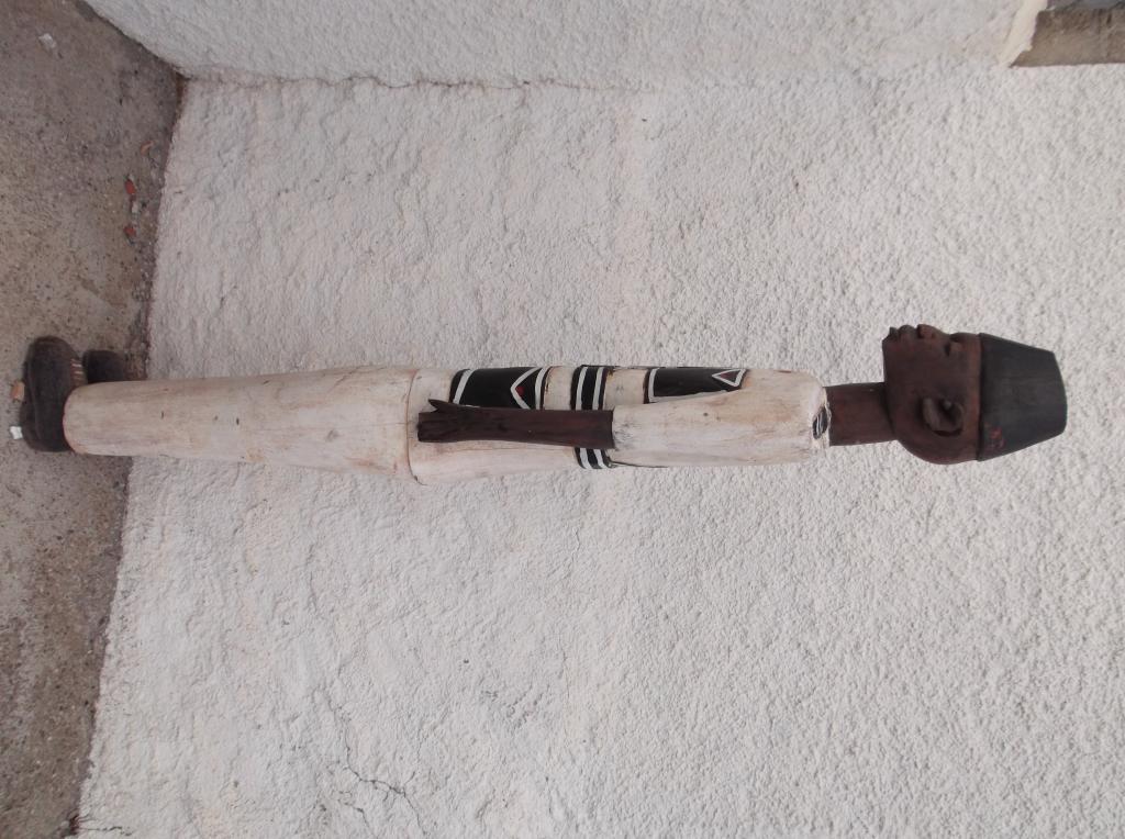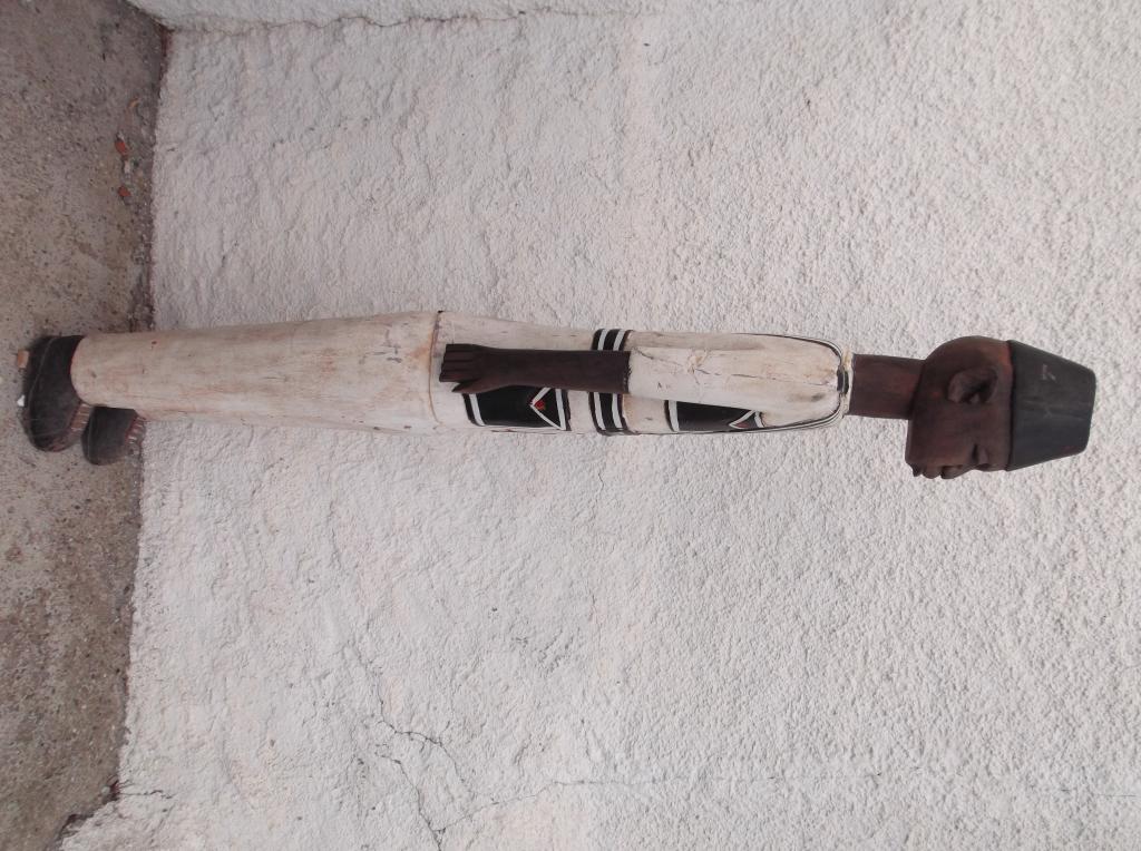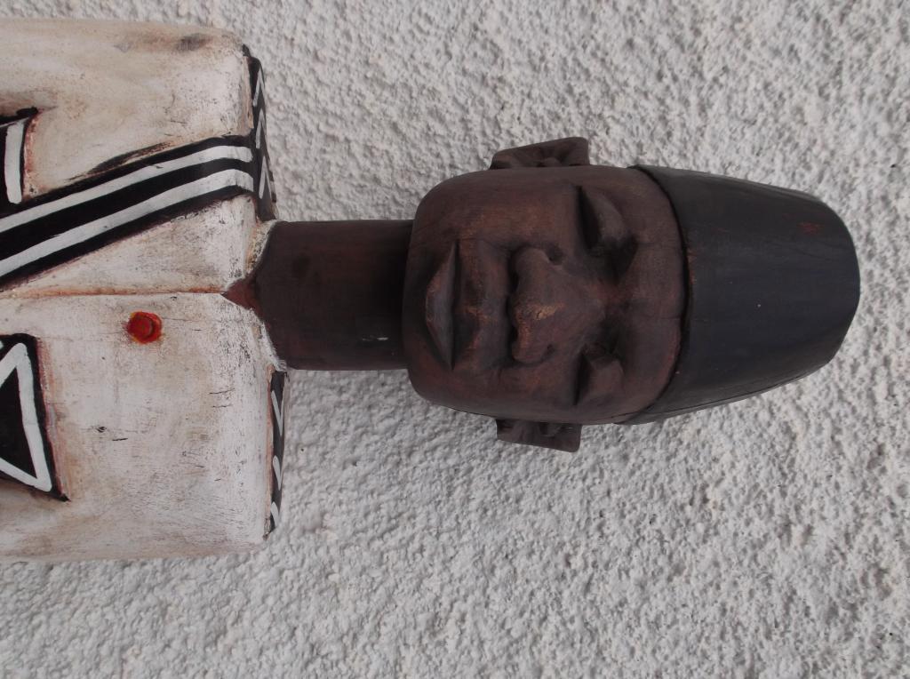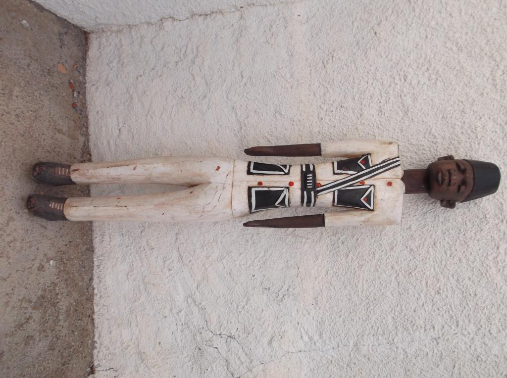 Figura makondé de mediados del siglo XX, pero es imposible decir si corresponde a la época de la creación de Tanzania o anterior. Perteneció a un diplomático español, ya fallecido, que estuvo en misión en la recién creada República de Tanzania, a finales de los años sesenta del pasado siglo. El estilo de uniforme parece corresponder al estilo colonial, aunque son muchas las dudas que se tresentan, pues no sabemos si es un uniforme de militar o de gendarme. Va tocado con un quepí negro del mismo color que los bolsillos de la chaqueta y el cinturón.. Contrariamente a la estatua 2896 el cuello de la chaqueta es raso y el pantalón es blanco igual que la chaqueta. En las hombreras lleva la distinción de su grado, tras galones en forma de "V" inclinada que parecen corresponder a un sargento o suboficial, pero puede tratarse de una fantasía del escultor. La estructura es exactamente la misma que la de la escultura que acabamos de citar. Nos ha parecido oportuno incluir esta estatua en la seccion de "Estatuas reales, de jefes y guerreros".