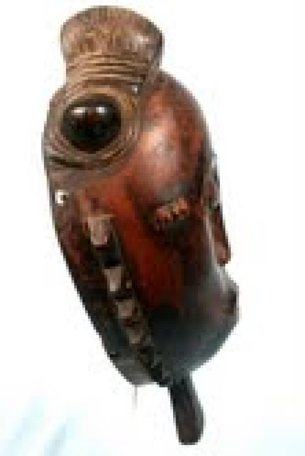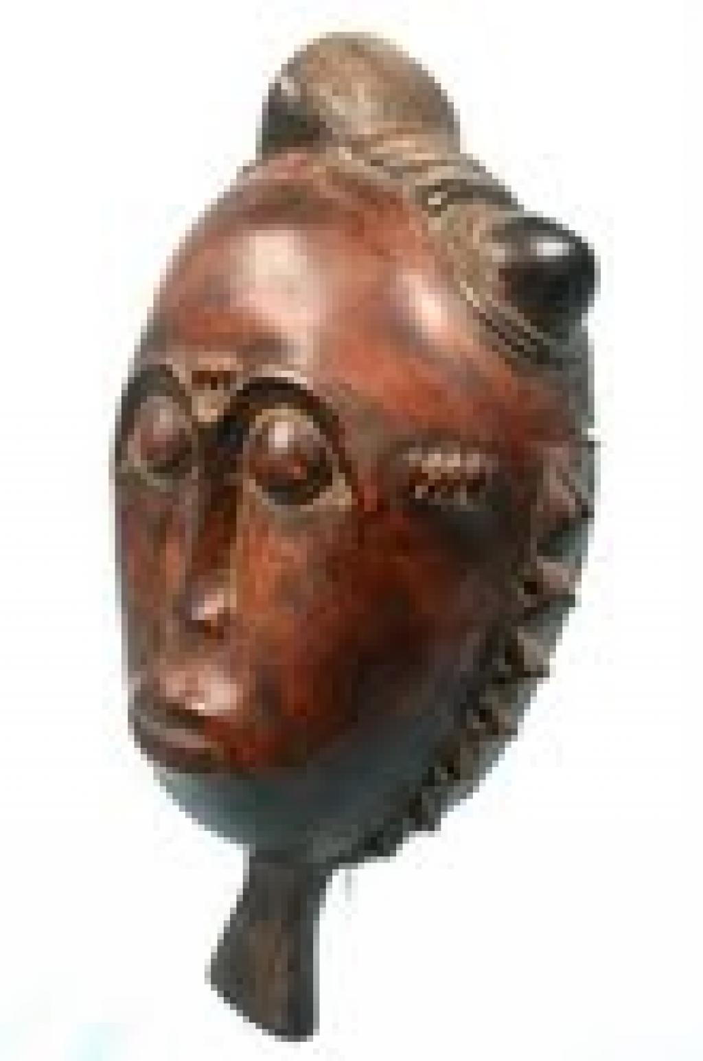 El festoneado triangular del rostro califica esta máscara como una máscara del sol. Esta categoría de máscaras participa en las festividades del Goli, una de cuyas máscaras más conocidas la "kple.kple" hace referencia al sol con los triángulos que normalmente la circundan, comparados a los rayos del sol. En este caso tenemos una máscara de mano. Pátina marrón.