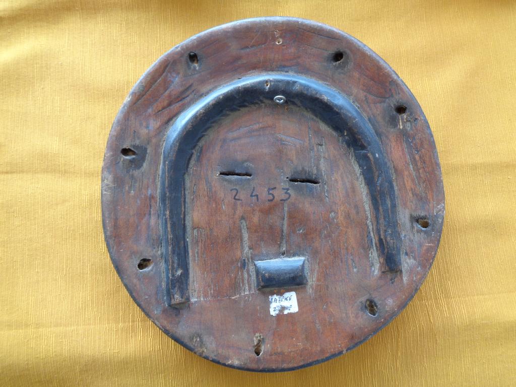 A pesar de ser una máscara plana los distintos símbolos esculpidos la confieren un pequeño relieve. Símbolos bastante complejos que, en la cosmogonía teké, representan el arco iris, el cuarto creciente de la luna y el sol, significando el contorno la línea del horizonte. Representa a la luna por los arcos de círculo que figuran en el borde de su circunferencia y al sol cuando mirando hacia el cielo, las plumas y cintas de rafia, de la vestimenta de su portador, que la circundan dan la impresión de un sol radiante.