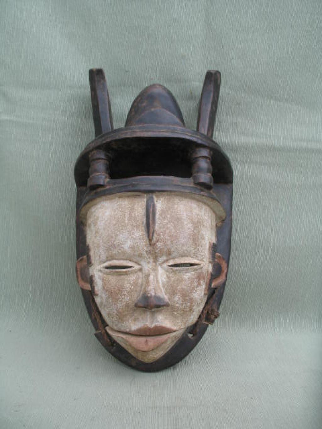 Máscara Ogoni Elu, que significa espíritu, de madera pintada con caolí y pigmentación negra en el tocado, orejas y labios rojos. Mandíbula articulada característica de las llamadas máscaras parlantes. Escarificación frontal vertical,alargada, y escarificaciones temporales semejantes a las de los Punu. Ojos rasgados, labios carnosos y punta de la nariz negra. Curioso tocado, negro, formado por dos plataformas separadas por una pequeñas columnas y la base posterior. Sobre la plataforma superior se eleva una protuberancia central a modo de moño o de coca, flanqueada por dos aletas. Estas máscaras representan a toda una serie de personajes desde un punto de vista humorístico destacando sus vicios y sus virtudes, pero también protegen a su portador cotra los hechiceros y el mal de ojo. E ilustran aspectos de su tradición oral.