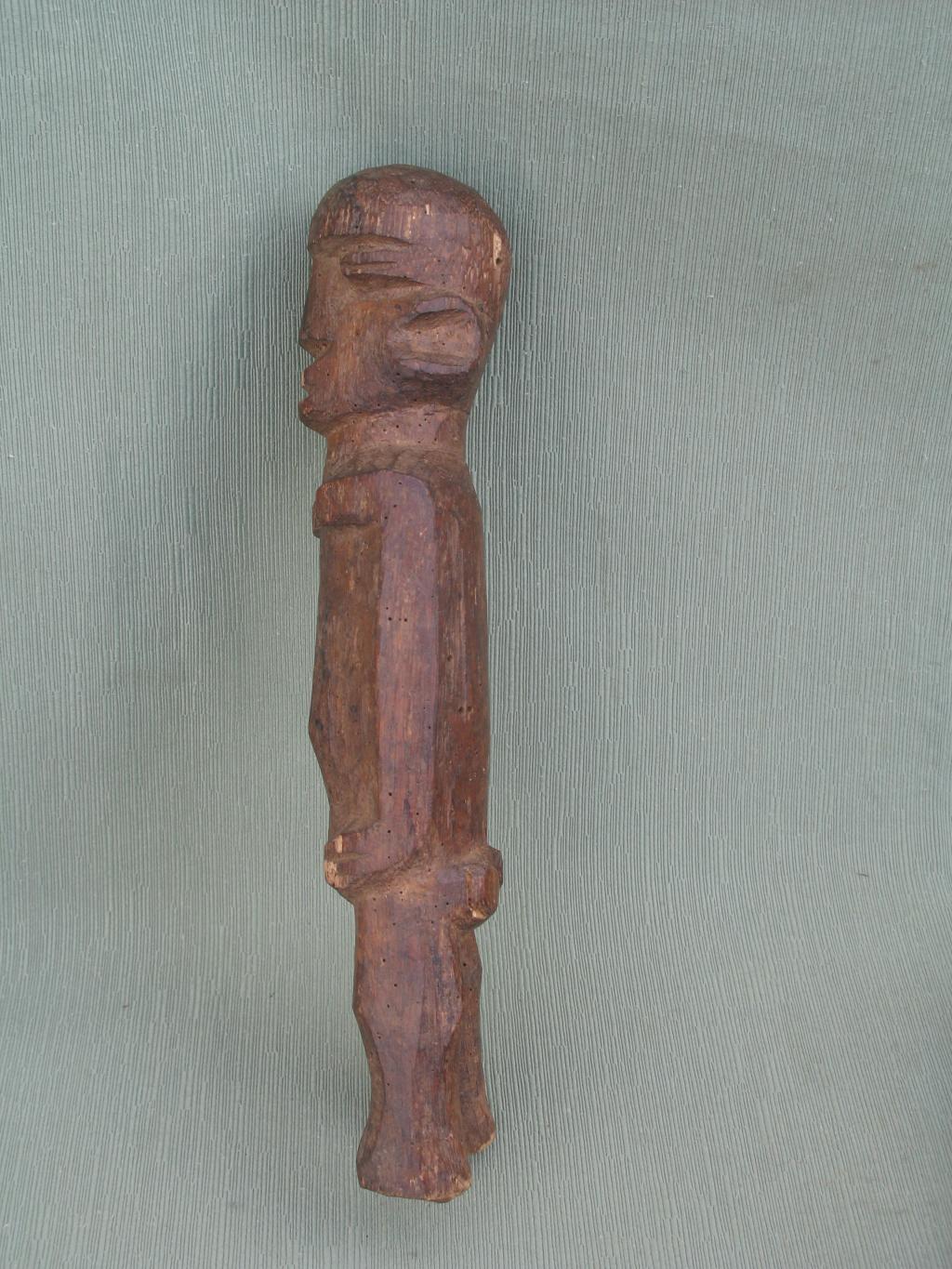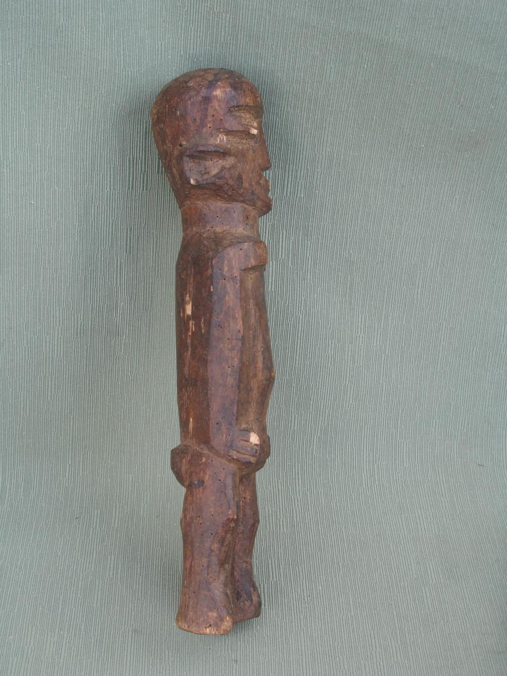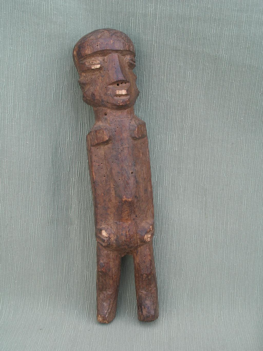 Los Lobi ocupan parte del norte de Costa de Marfil, al norte de la reserva de fauna de Buna y al sur de Burkina Faso. Son un pueblo de agricultores y de cazadores. Los Lobi creen en un Dios Supremo “Thangbo Thu”, creador del universo que interviene en la vida de los hombres por medio de una multitud de Thils, espíritus invisibles cuya misión es proteger a los hombres y de los “Kontuor”, genios del bosque o de la tierra, pequeños seres pilirrojos que pueden manifestarse a los hombres de forma visible. Los Lobi organizan sus comunidades en torno a estos espíritus de la naturaleza, porque cuando se les honra manifiestan su benevolencia bajo la forma de lluvias abundantes, buena salud para las personas, animales y campos, y nacimientos numerosos, si se les ignora enviarán epidemias devastadoras, sequías y sufrimientos. Estos espíritus transmiten a los adivinos las leyes que los adeptos deben seguir para recibir su protección. Estos espíritus son representados por medio de los “bateba”, esculturas talladas por sus propietarios, especialmente por los jefes de familia. Para ello, los thils han pedido a los humanos que hagan una estatua del antepasado fundador del linaje para perpetuar sus conocimientos a lo largo del tiempo, ya que a través de la palabra venerada de los antepasados se revela su mensaje silencioso. Lo importante de los “bateba” no es su estética sino su fuerza mágica, su capacidad de acción y de protección. Estos bateba destinados a proteger a sus propietarios, se colocan en las tumbas, en los rincones oscuros de las casas o en los altares familiares junto a otros muchos batebas que encarnan a otros tantos espíritus, pues también son muchos los peligros que acechan a los hombres. La mayoría de los bateba son mascilinos, pero los hay también femeninos. Con frecuencia los bateba masculinos son representados con senos bastante prominentes lo que les confiere un aspecto hermafrodita. Las estatuas femeninas se llaman Thilburu y son estatuas de los altares familiares. Los peinados de los bateba son generalmente lisos. Siguiendo las instrucciones de los hechiceros se construyen también altares en el interior de las viviendas o sobre los tejados. Los bateba, normalmente de madera aunque pueden estar también esculpidos en piedra, son pequeñas estatuillas que pasan raramente del medio metro, no llegando algunas a los diez centímetros. Normalmente se tallan en maderas blancas y blandas aunque también los hay en maderas rojizas y densas. Los bateba duntundora se encuentran entre los de mayor tamaño y tienen virtudes apotropaicas asegurarán una protección a cambio de ofrendas y con su aspecto agresivo alejarán de las familias las fuerzas de mal. Otros bateba, encarnarán a distintos Thil, que serán reconocidos por su actitud. El Thil peligroso se presentará con los brazos levantados o abiertos mientras que otros más pacíficos adoptarán una actitud normal, de brazos que penden a lo largo del cuerpo e incluso podrán representar a una mujer o una maternidad, símbolo de la fertilidad y de la riqueza que inundará la casa. Estas estatuillas sirven para comunicar con los espíritus que les invaden, los thils, que son los ancestros del clan y del matriclan y que rigen la vida cotidiana de la gente. En pareja, los bateba favorecen la fertilidad de la mujer y especialmente el nacimiento de gemelos. El nombre “bateba” significa “los remedios que murmuran palabras oscuras”.