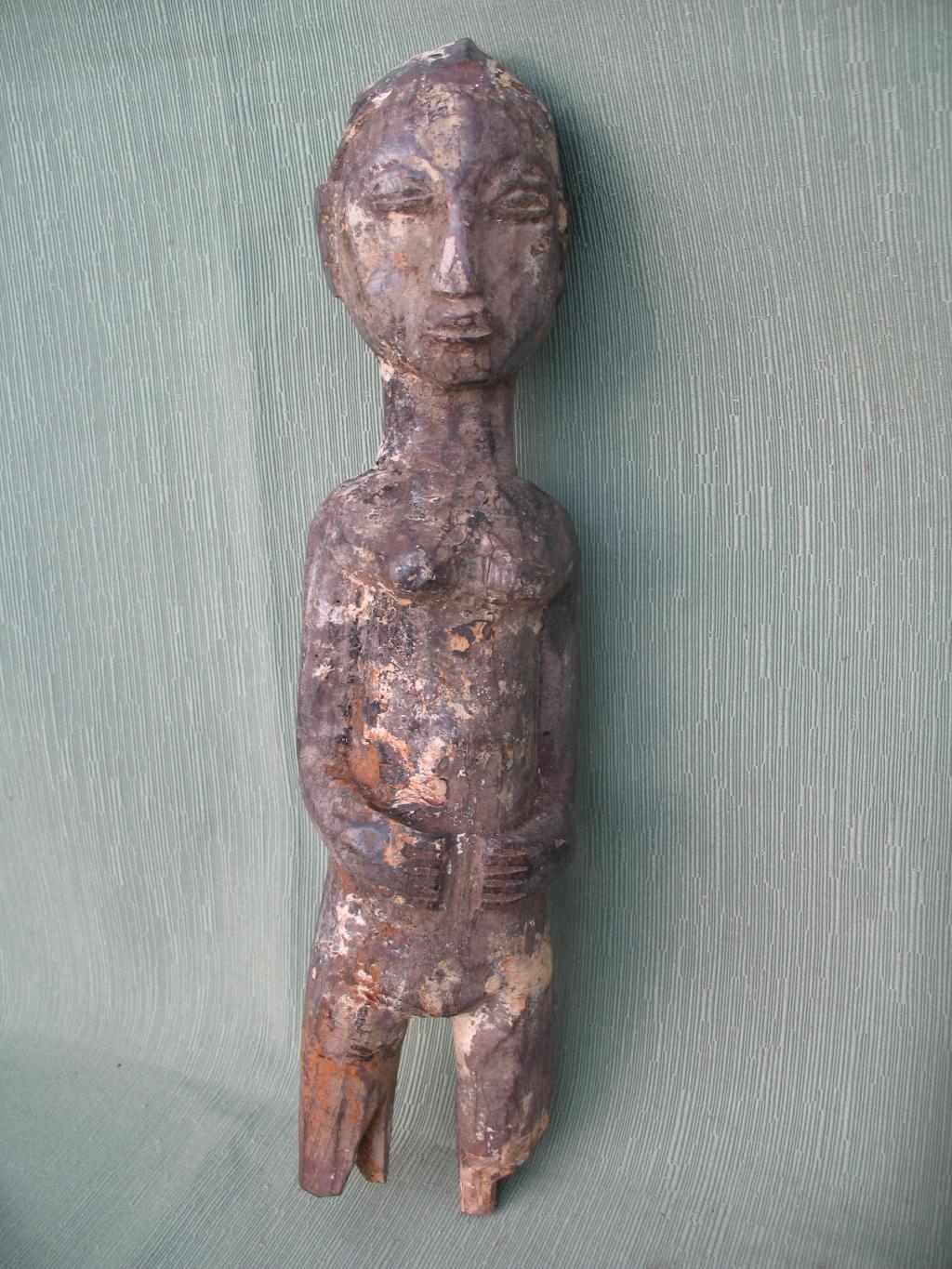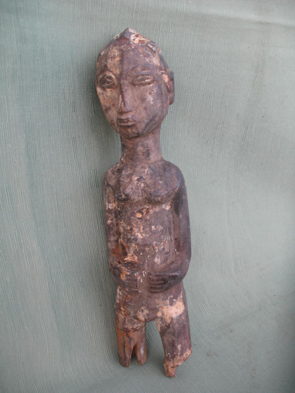 Pequeña y muy antigua estatua de Blolo bla. Faltan los pies y parte de las piernas perdidas a través del tiempo. El rostro presenta una gran serenidad. Coserva conserva numerosos restos de caolín y de otras libaciones. Pátina muy antigua.