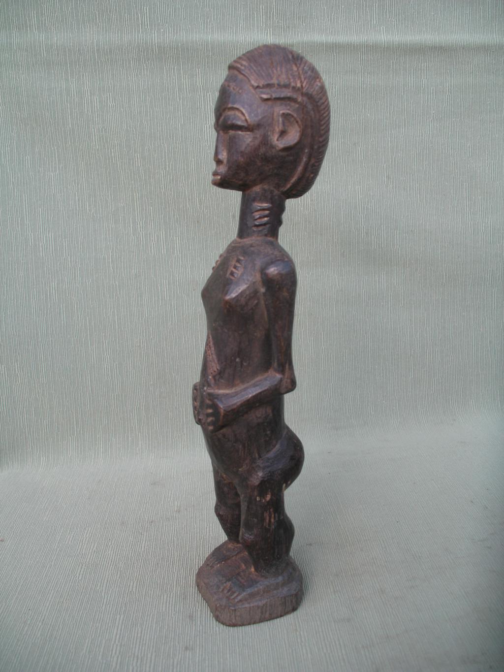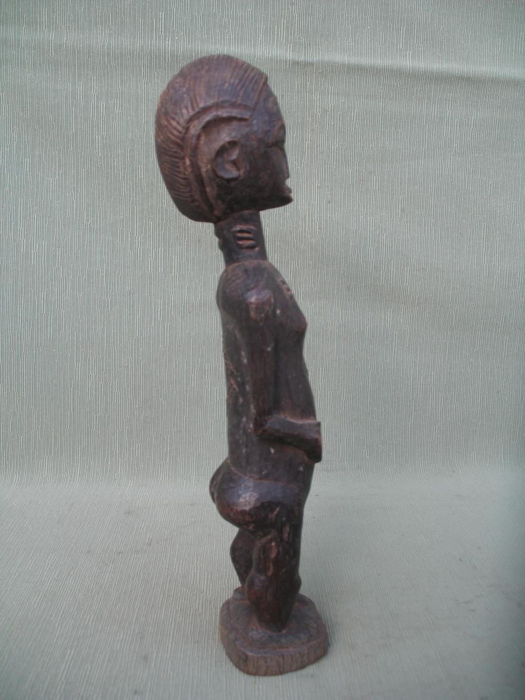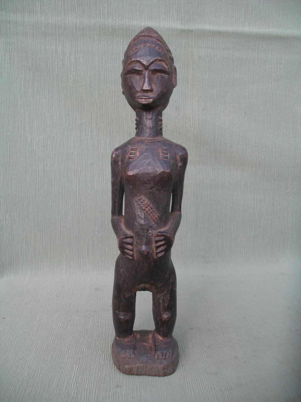 Fina figura de joven mujer baulé, iniciada, de pequeños pechos de mujer que aún no ha sido madre. Pátina muy oscura.