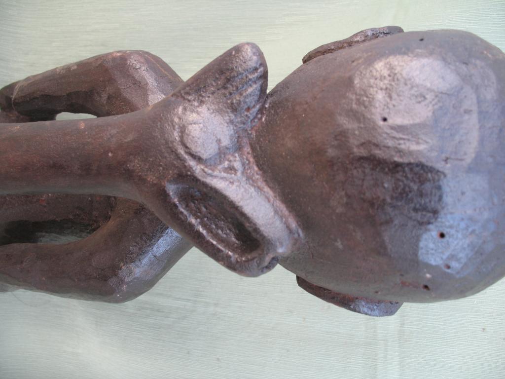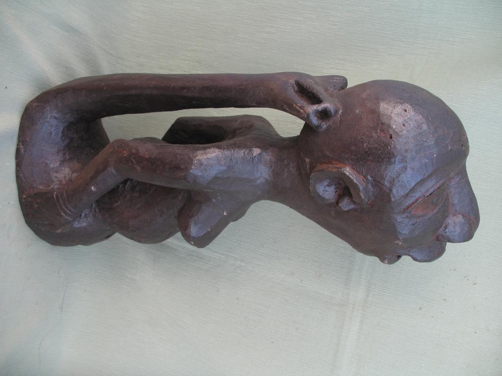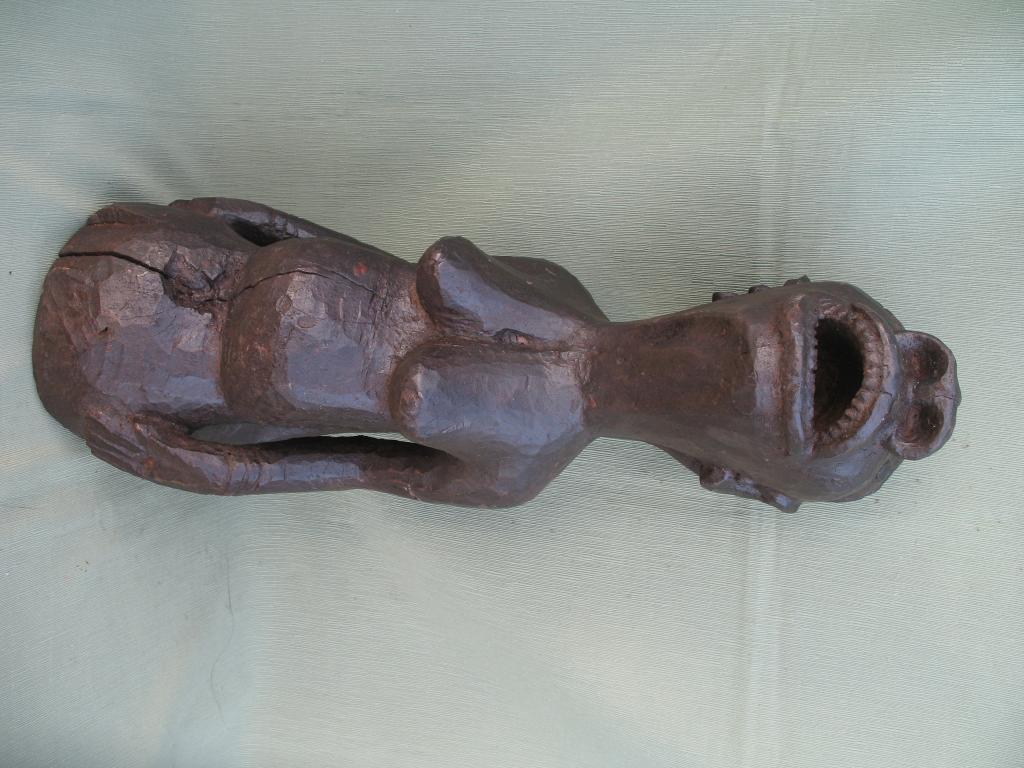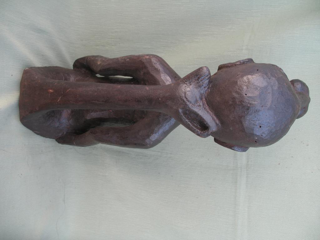 Curiosa pieza que representa a una antepasada. La estatua, está arrodillada y no tiene piernas, en su lugar hay una especie de cola de pescado que acaba en la cabeza del dragón frecuente en la estatuaria bidjogo. La cabeza se apoya sobre un cuello fuerte y largo y está totalmente inclinada hacia el cielo con la boca abierta en actitud imploratoria. Estas estatuas se utilizan en los cultos domésticos. Se trata de una deidad femenina protectora de la pesca. Pátina muy oscura. Estas figuras de personajes con la boca abierta y mirando al cielo son frecuentes en la estatuaria bidjogo. Puede verse esta estatua en la imagen adjunta tomada en la isla de Bubaque. Madera oscura, pesada y dura.