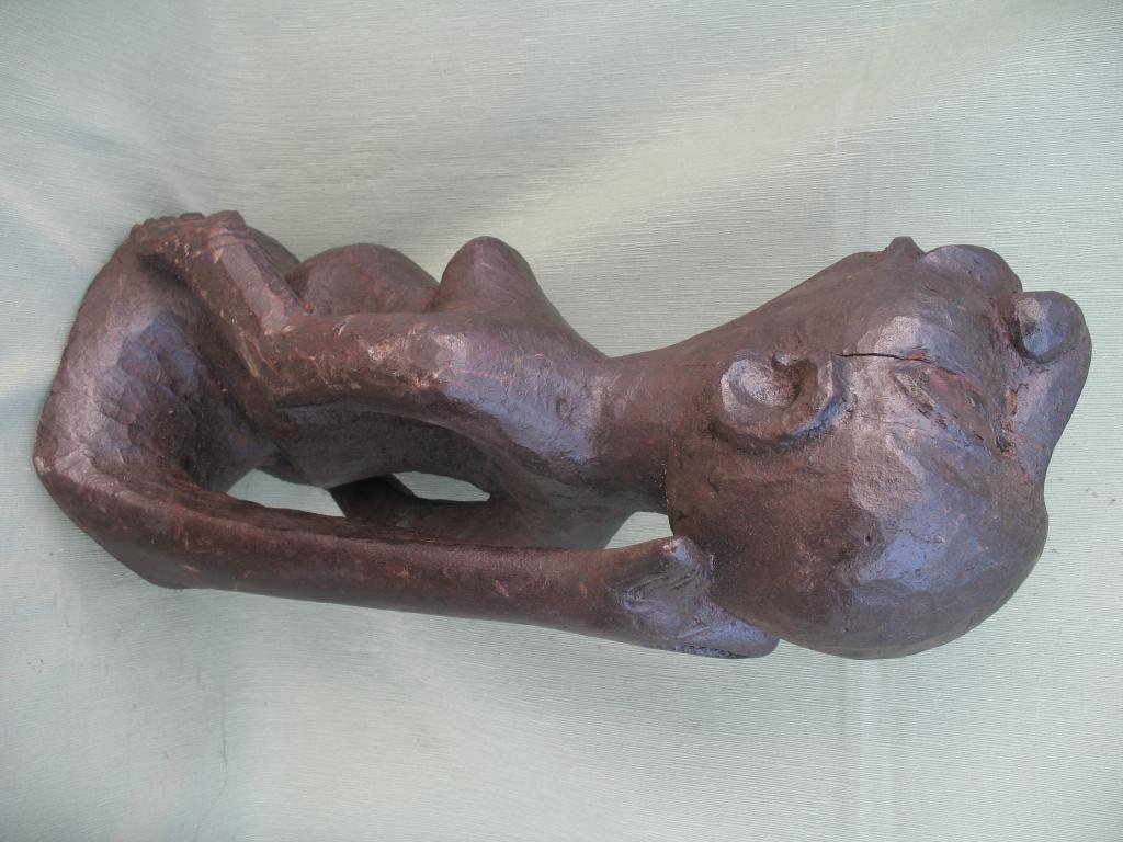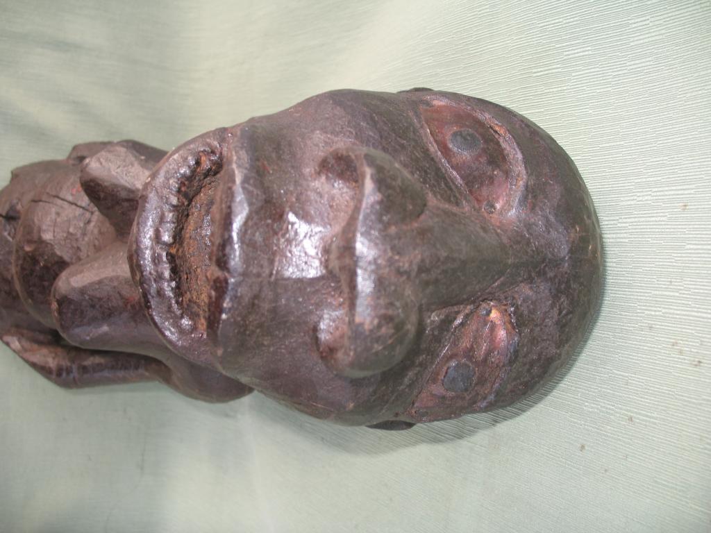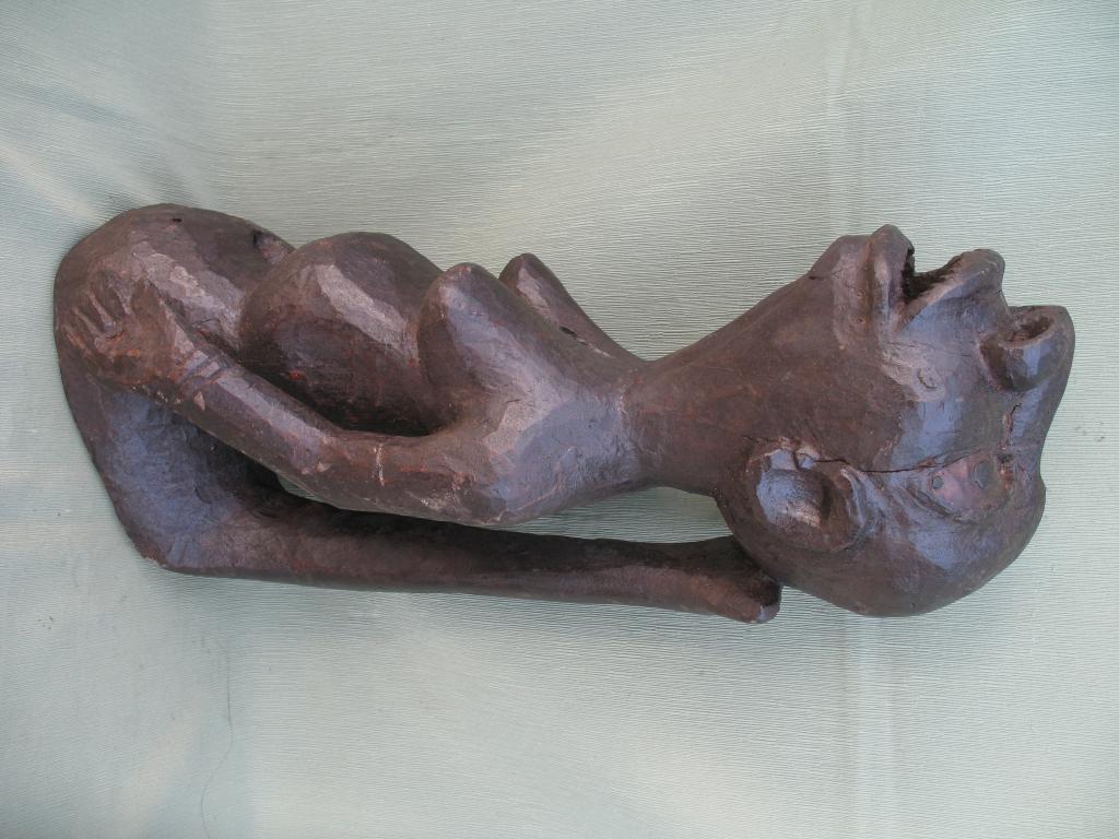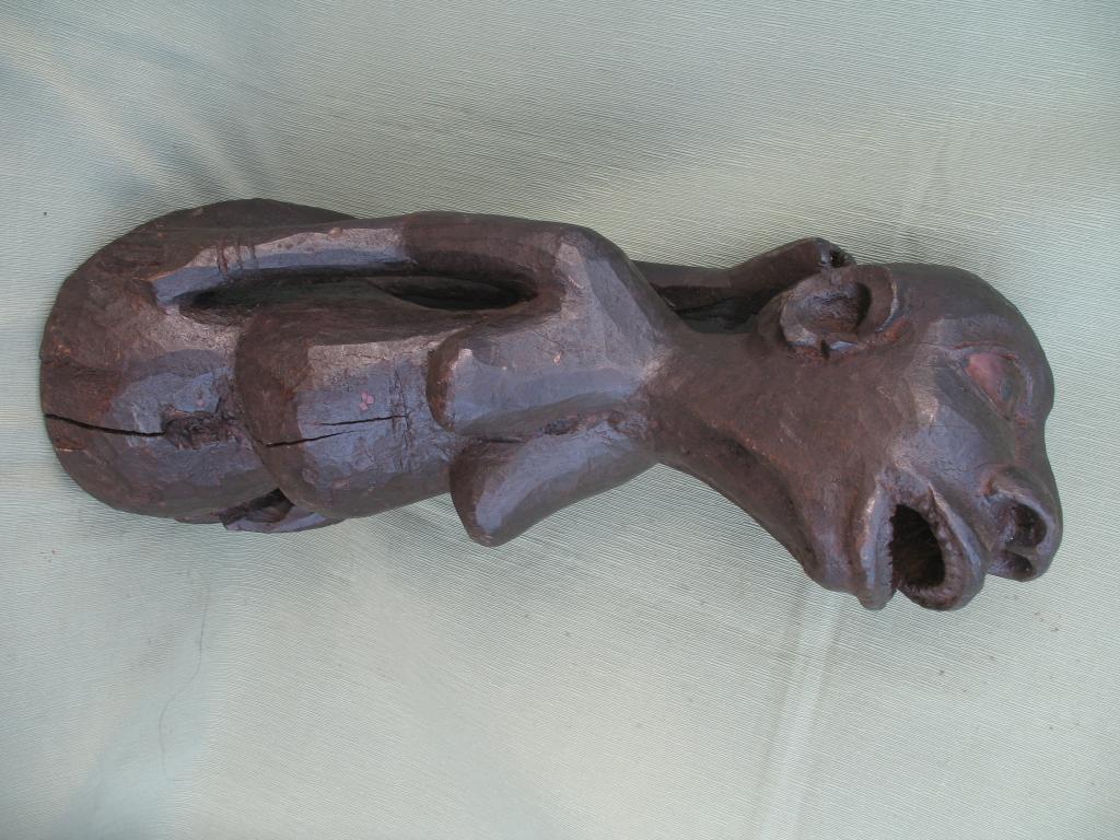 Curiosa pieza que representa a una antepasada. La estatua, está arrodillada y no tiene piernas, en su lugar hay una especie de cola de pescado que acaba en la cabeza del dragón frecuente en la estatuaria bidjogo. La cabeza se apoya sobre un cuello fuerte y largo y está totalmente inclinada hacia el cielo con la boca abierta en actitud imploratoria. Estas estatuas se utilizan en los cultos domésticos. Se trata de una deidad femenina protectora de la pesca. Pátina muy oscura. Estas figuras de personajes con la boca abierta y mirando al cielo son frecuentes en la estatuaria bidjogo. Puede verse esta estatua en la imagen adjunta tomada en la isla de Bubaque. Madera oscura, pesada y dura.