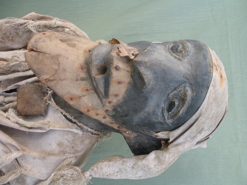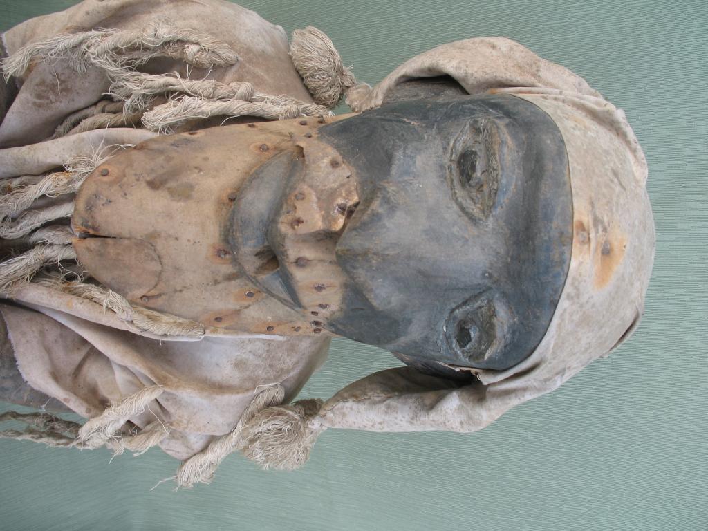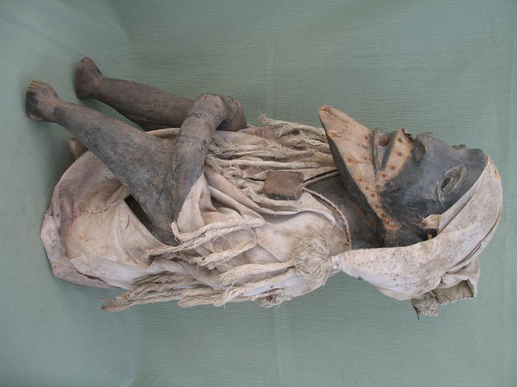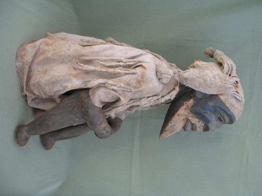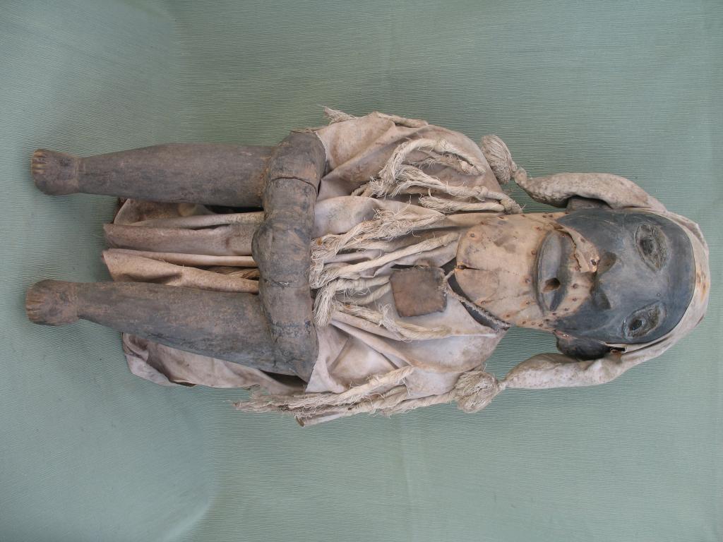 Extraña figura de un antepasado dedicada al culto familiar. El hombre aparece sentado, en una actitud tranquila como corresponde a un protector. Los brazos están apoyados en las rodillas y las manos, delante, enlzadas. Colgando del cuello lleva un gri-gri, amuleto protector. Va tocado con un gorro de tres picos terminados en pompones. Viste la camisola típica bambara. El mentón y el bigote estaban recubiertos de pelo, que se ha perdido en el transcurso del tiempo. Es muy raro encontrar una figura de este tipo en la estatuaria africana.