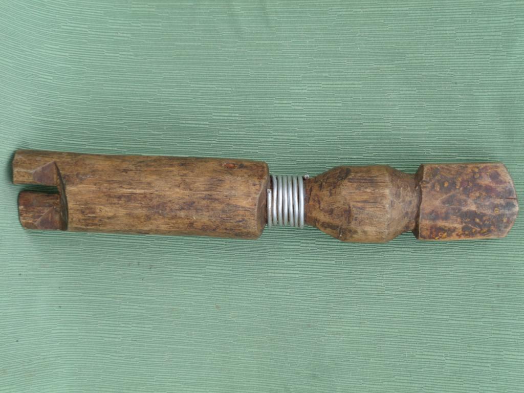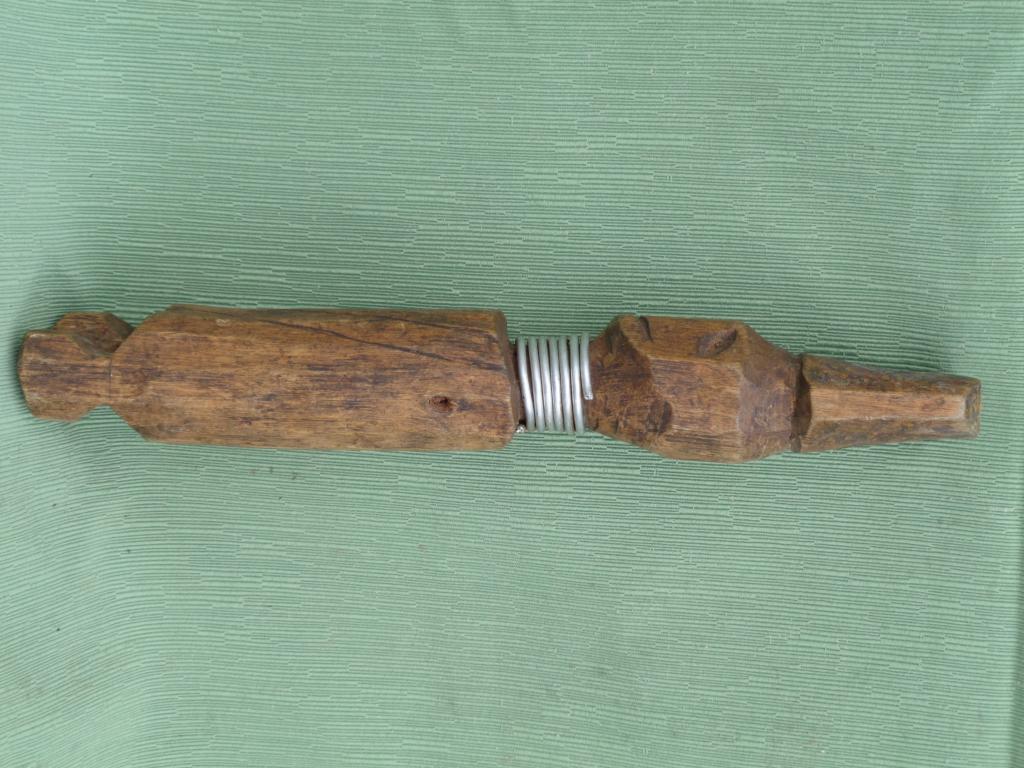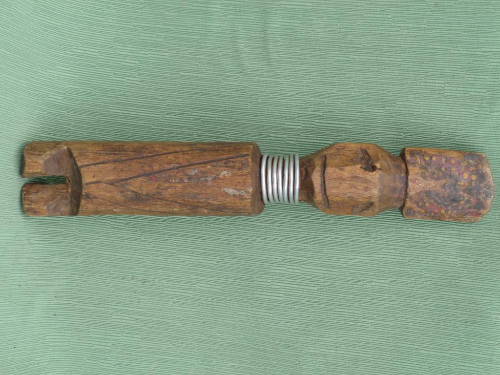 Figura protectora destinada a recibir culto en los altares familiares de los Karo, el grupo más sedentario de todos los pueblos del Omo. Es una figuraa tosca, de sencilla realización, casi infantil. Lleva un alambre enrollado en torno al cuello con las anillas bien asentadas una sobre otra, el tocado moeadso, piernas muy cortas y carece de brazos. La cara solo presenta ojos y boca. La nuca con rayas verticales y y el cuerpo se ve surcado por dos dibujos geométricos en forna de "V" con el vértice hacia abajo. Antigua pátina de uso.