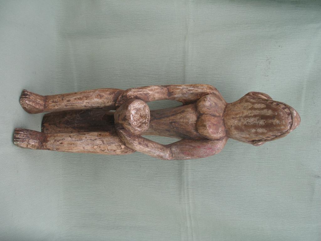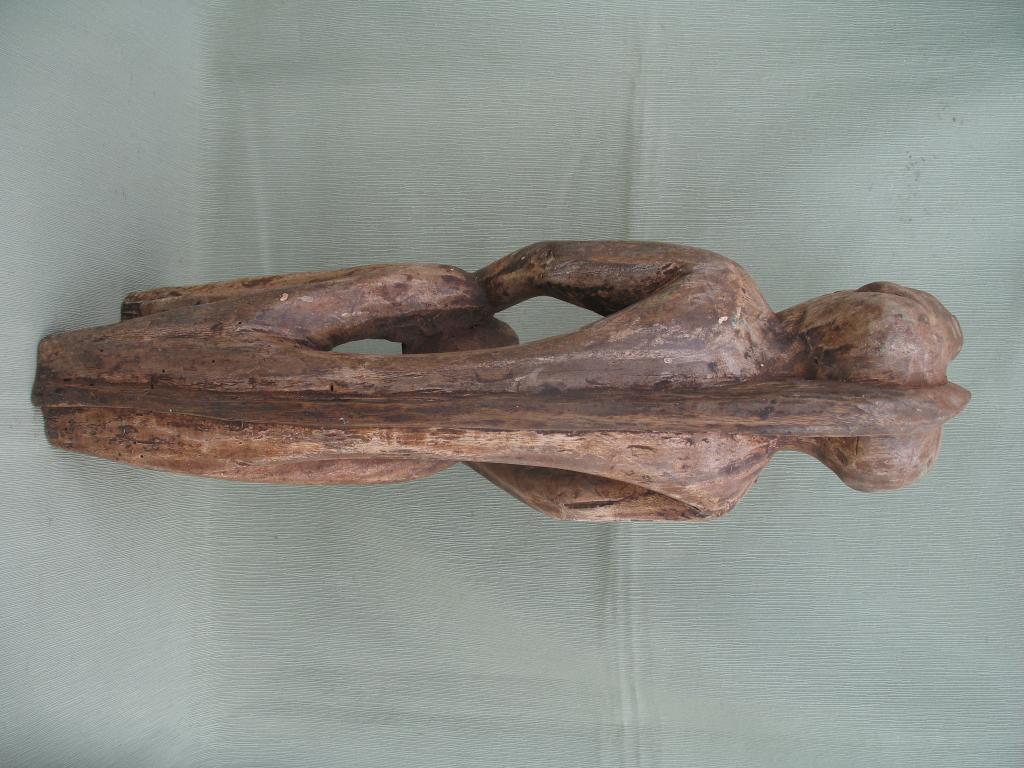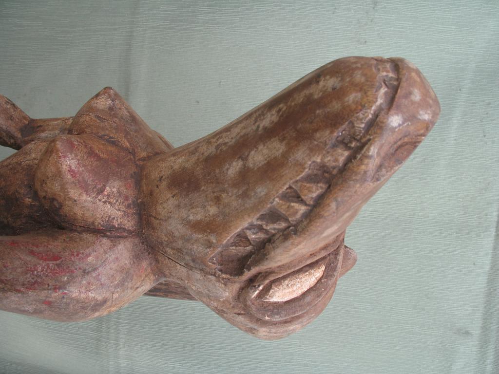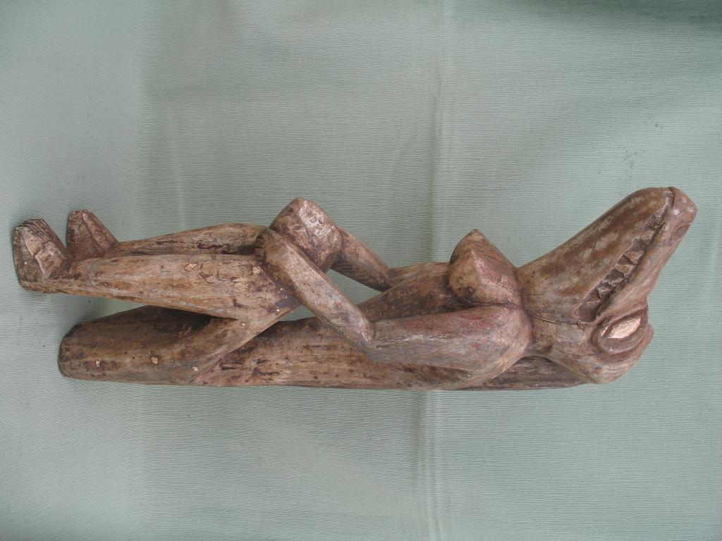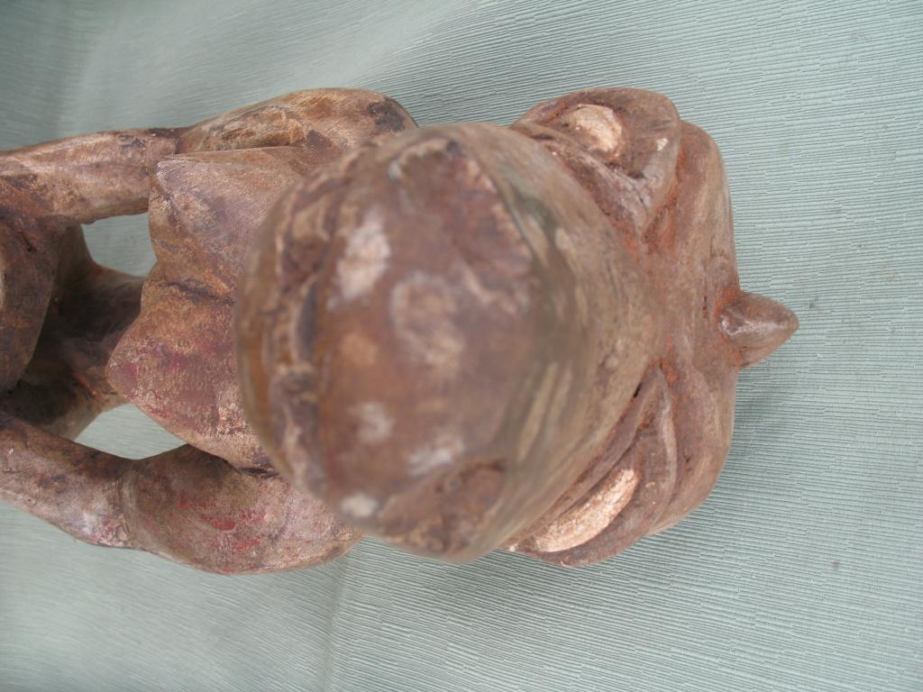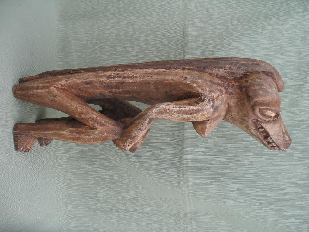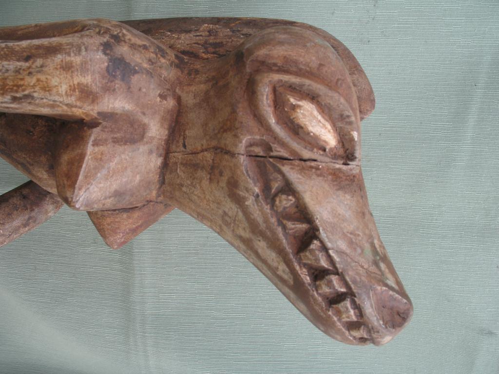 Rara pieza destinada a los cultos vudú. La palabra « vudú » es una adaptación “fon” de un término yoruba que significa “dios”, y el vudú nace del encuentro entre los cultos yorubas y los dioses de los Fon y de los Ew de Togo por lo que vudú sería el conjunto de dioses o de fuerzas sobrenaturales cuyos favores y mediación tratan de obtener los Fon, los Ewe, y en menor medida los Yoruba. Los esclavos de estos pueblos son quienes exportaron el vudú a América. El vudú en África es un elemento importante de la cultura de esos pueblos y de muchos pueblos de Ghana, Benin, Togo, Nigeria y otros pueblos costeros. Estos pueblos tienen un panteón en el que adoran a un número incalculable de dioses. Estos dioses de cuerpo antropomorfo y cabeza de cocodrilo podrían estar inspirados en los numerosos “dioses cocodrilos de la mitología egipcia al igual que se inspiran también en ella algunos otros dioses de su panteón. Esta figura de los colores blanco y negro tiene una copa de ofrendas en sus manos y está sentada sobre sí misma. Su cabeza aunque con un morro algo corto es lo más parecido al del cocodrilo. En la amplia literatura existente sobre el vudú no he encontrado en sus panteones ninguna deidad que corresponda a esta morfología. Y tampoco ha sabido darme una respuesta ninguno de los numerosos especialisas a quienes he consultado. Y no cabe duda de que perenece a una deidad de su panteón. Perteneció al padre del anticuario senegalés Mamadou Marema Diop, de la tercera generación de anticuarios. No se ha visto una figura semejante en ningún libro de arte africano ni en ninguna galería de ventas.