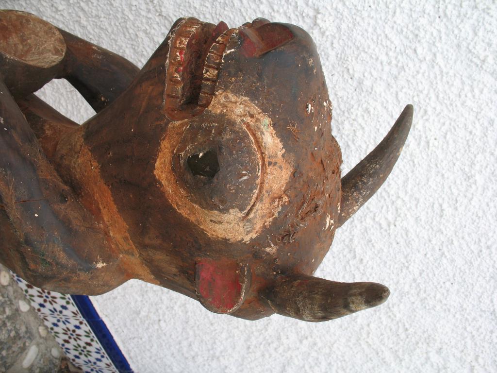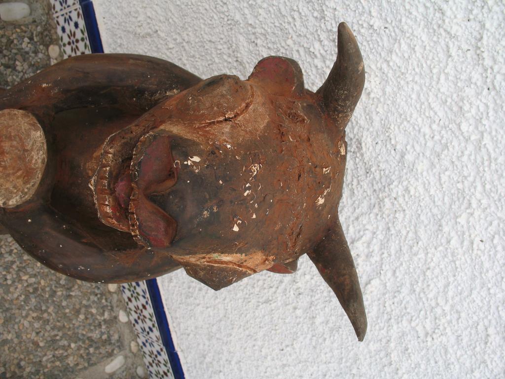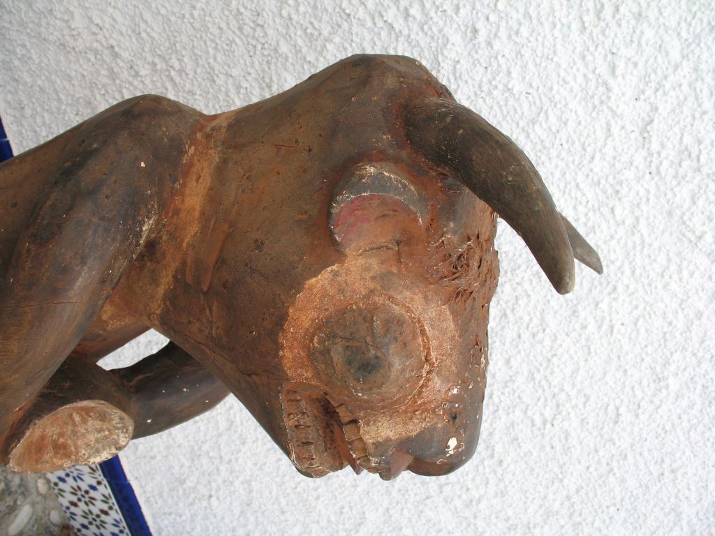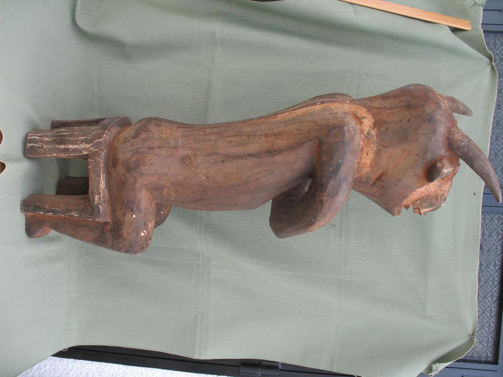 Gran estatua de un Dungbe senado. El Dungbe es el toro cuya cabeza portan los cabaros en la iniciación imitando los gestos del animal. Esta gran estatua porta una copa de ofrendas en sus manos y está destinada a los ritos de iniciación de los cabaros, que es el grupo al que pertenecen los jóvenes bidjogos de la edad de diecisiete a los veintisiete años, época en la que se posee toda la fortaleza física. Escultura nunca vista en ningún libro referente al arte africano ni en ninguna gaalería de ventas. Perteneció a la colección privada del padre del anticuario senegalés Mamadou Marema Diop, de la tercera generación de anticuarios.