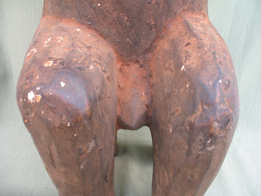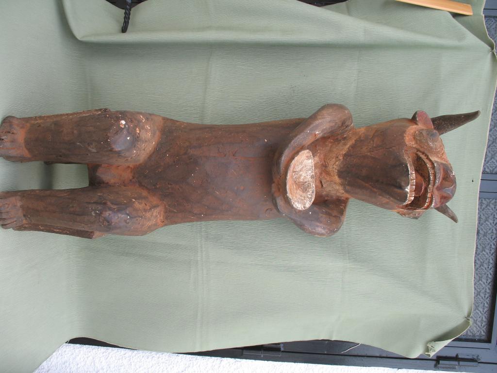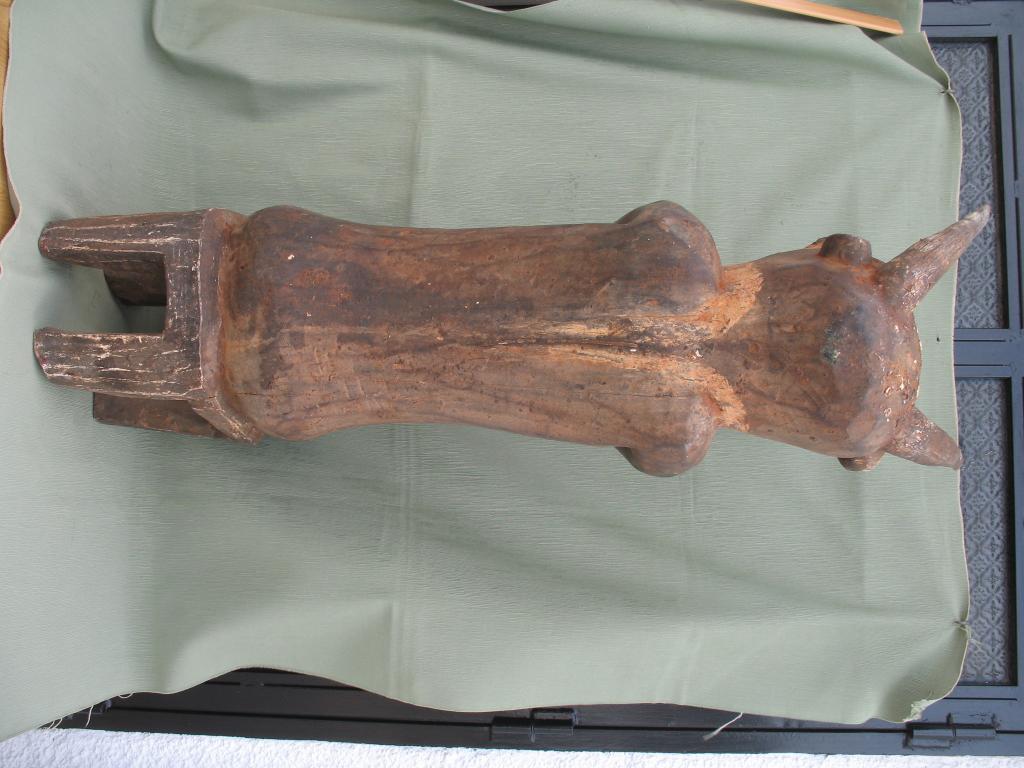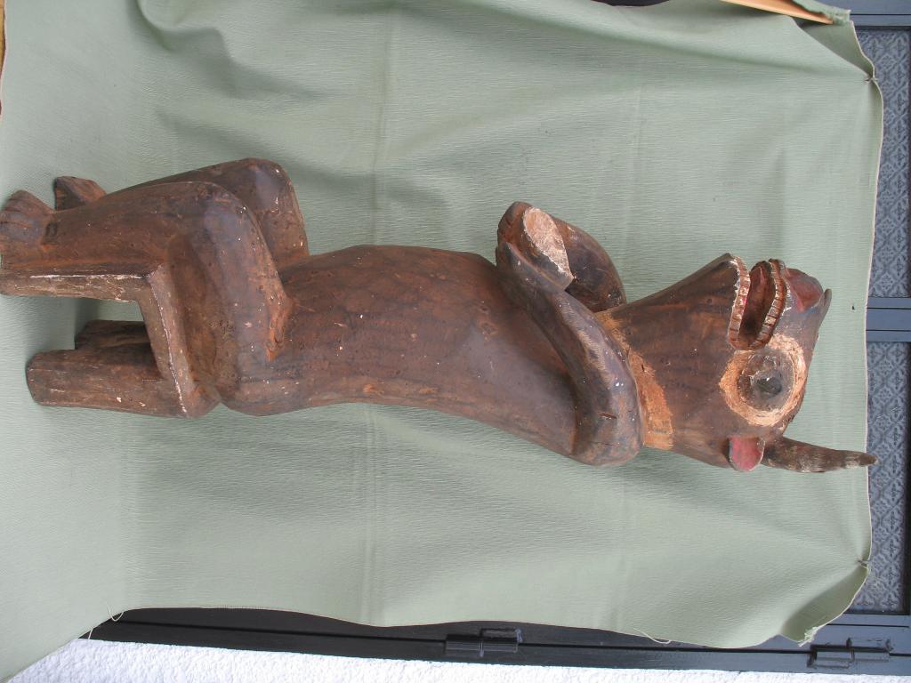 Gran estatua de un Dungbe senado. El Dungbe es el toro cuya cabeza portan los cabaros en la iniciación imitando los gestos del animal. Esta gran estatua porta una copa de ofrendas en sus manos y está destinada a los ritos de iniciación de los cabaros, que es el grupo al que pertenecen los jóvenes bidjogos de la edad de diecisiete a los veintisiete años, época en la que se posee toda la fortaleza física. Escultura nunca vista en ningún libro referente al arte africano ni en ninguna gaalería de ventas. Perteneció a la colección privada del padre del anticuario senegalés Mamadou Marema Diop, de la tercera generación de anticuarios.