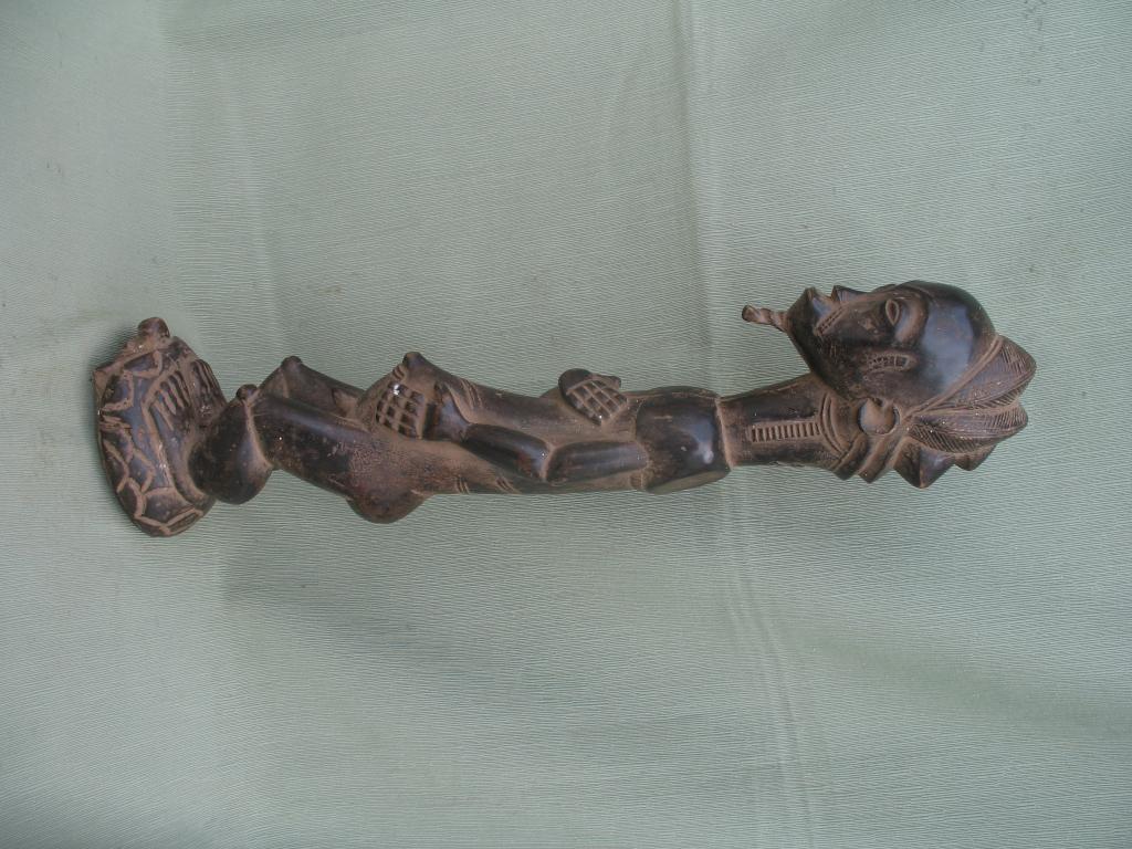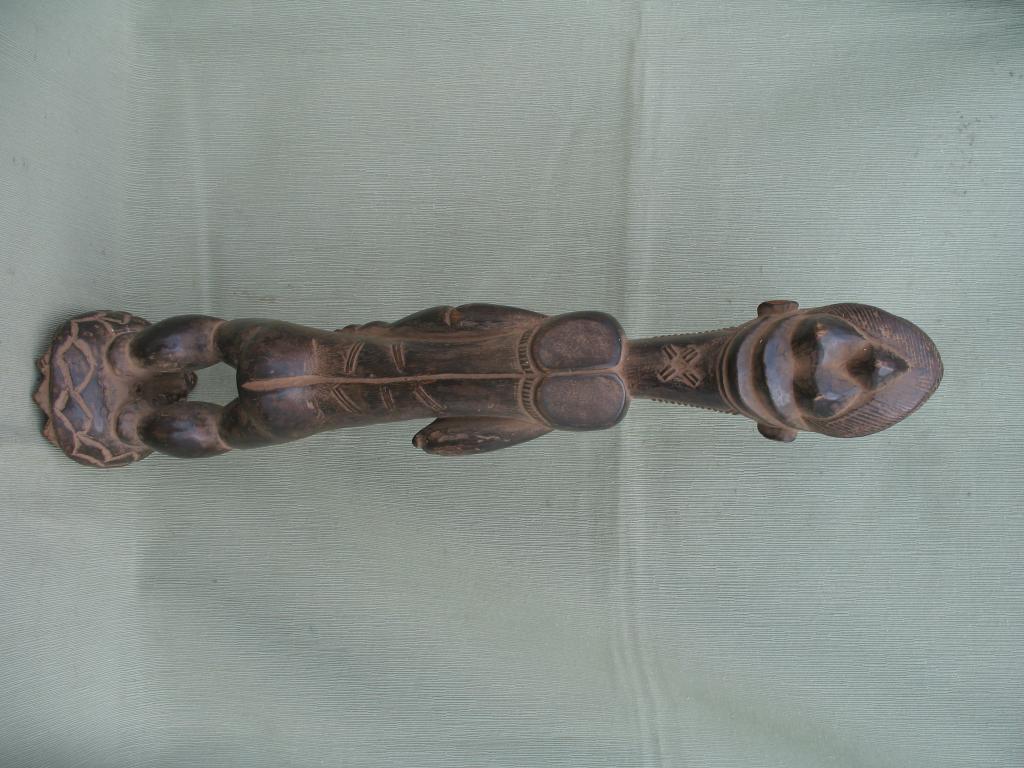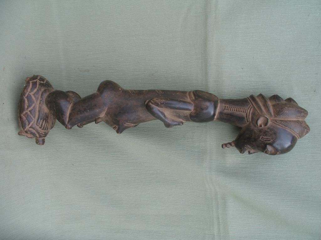 La tortuga es uno de los animales místicos y míticos de la cosmogonía baulé. Simboliza la paciencia y la temeridad. Todo hace pensar que el personaje montado sobre su caparazón es un Asié Usu o genio de la naturaleza, que puede ser protector si se le ofrecen los sacrificios propiciatorios. Pátina negra.