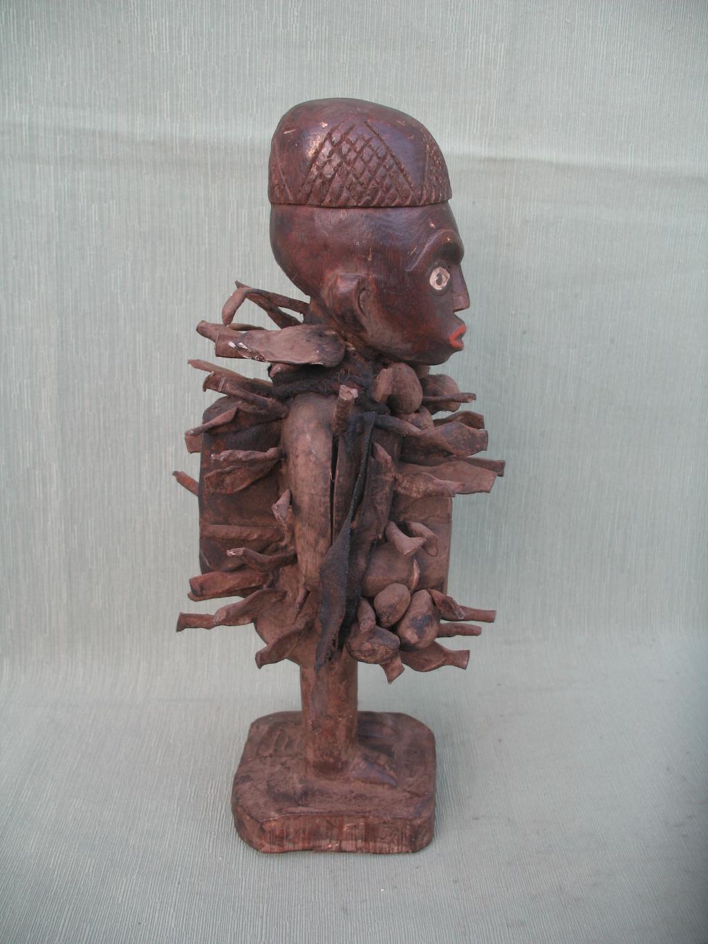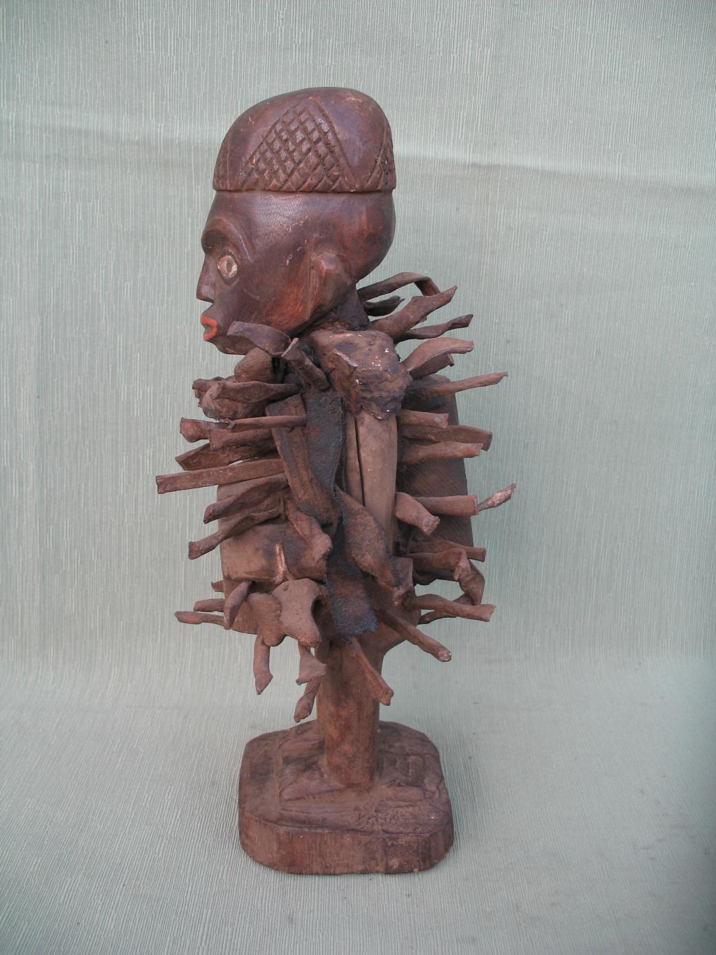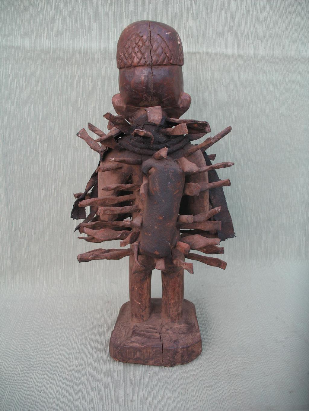 Estos fetiches ya sean de clavos o de cuchillas son el símbolo del poder mágico por excelencia, utilizados en las Repúblicas Popular y Democráticadel Congo, antiguo Zaire esta última. Este fetiche es de hierros y clavos aplastado, con una carga ventral y varios bilongos o cargas mágicas en el cuello.