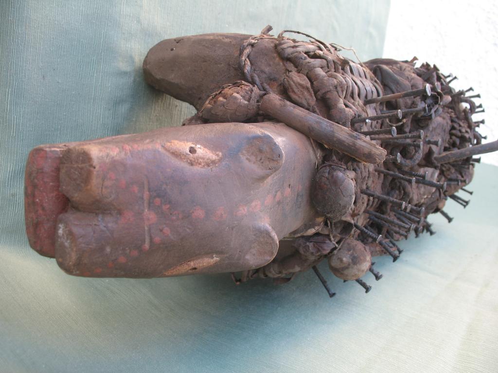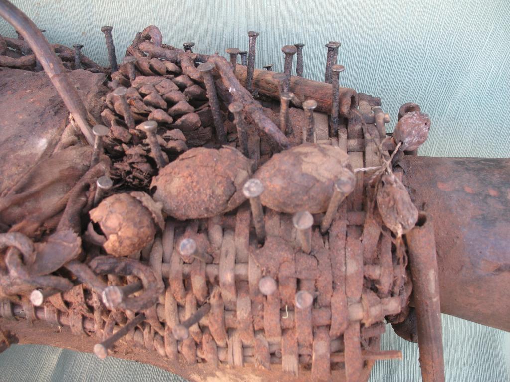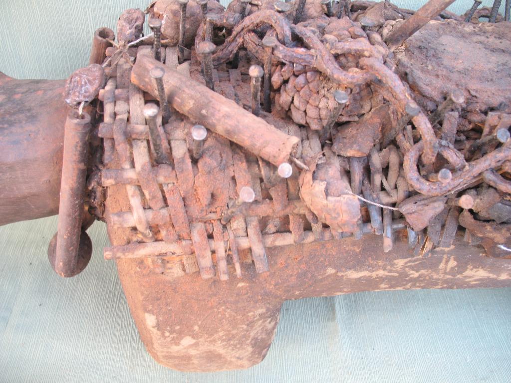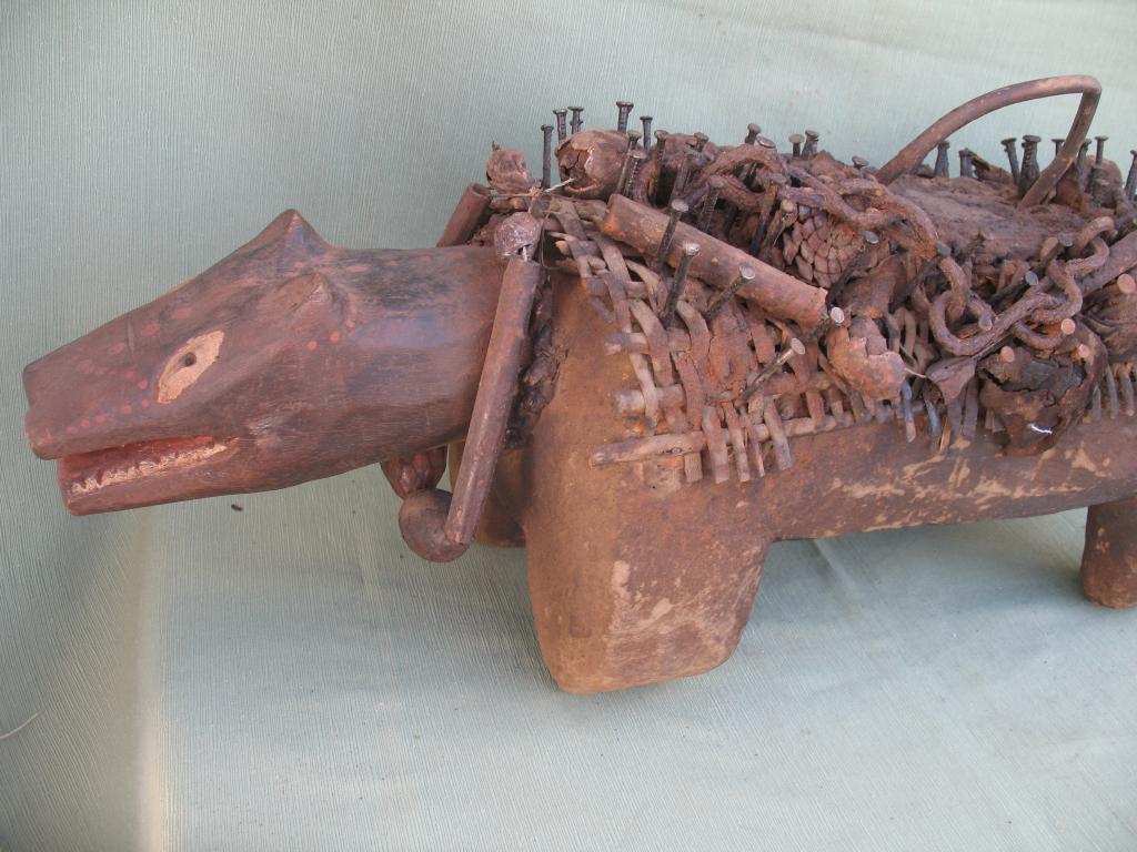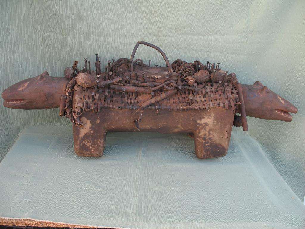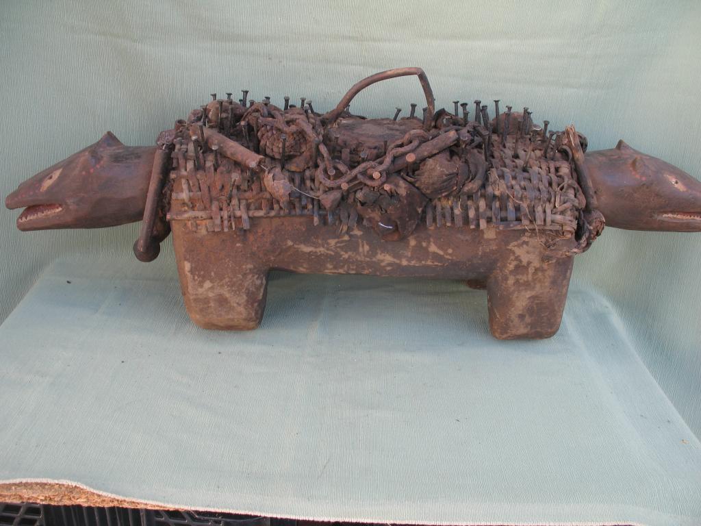 KOSSO: Es el nkissi kondi en forma de perro cubierto de clavos o de láminas de hierro. Gracias a su olfato puede perseguir y detectar a los hechiceros ndoki para que sean capturados y no puedan causar daños. Con frecuencia es representado con dos cabezas, una detecta las amenazas y la otra defiende a su propietario. El kosso es mediador entre el mundo de los vivos y el de los espíritus. Tiene además todas las propiedades de los nkissi kondi. Kosso de tamaño importante que conserva restos de libaciones rituales. Pátina antigua.