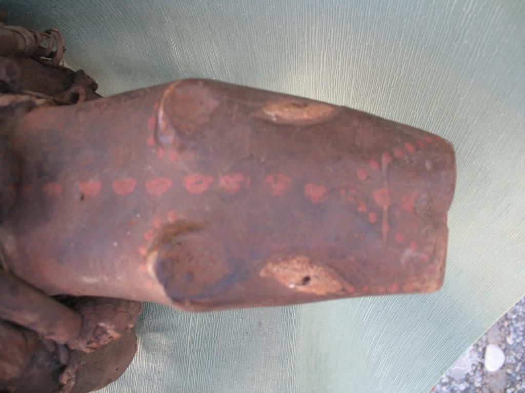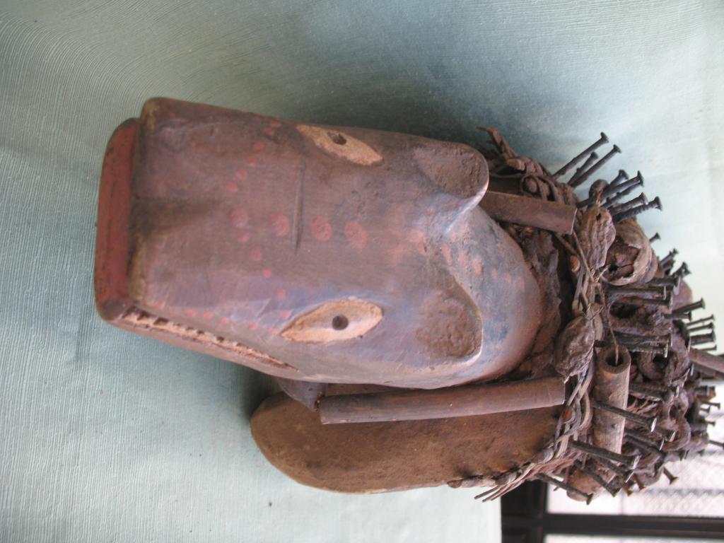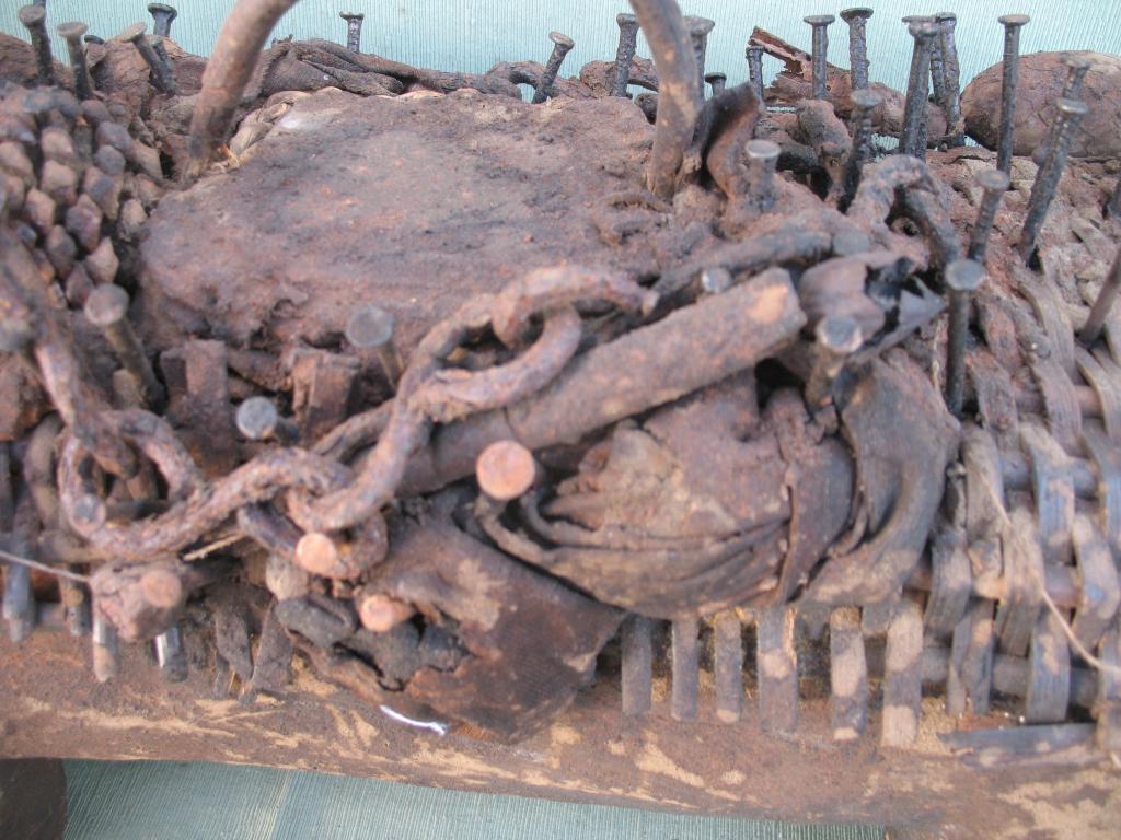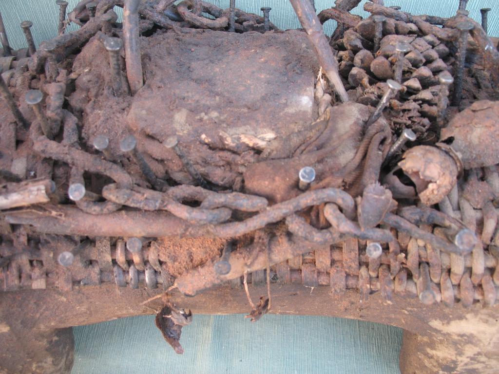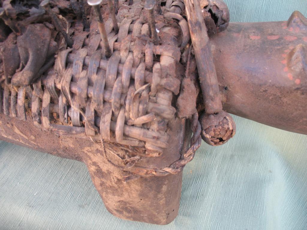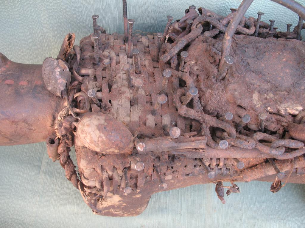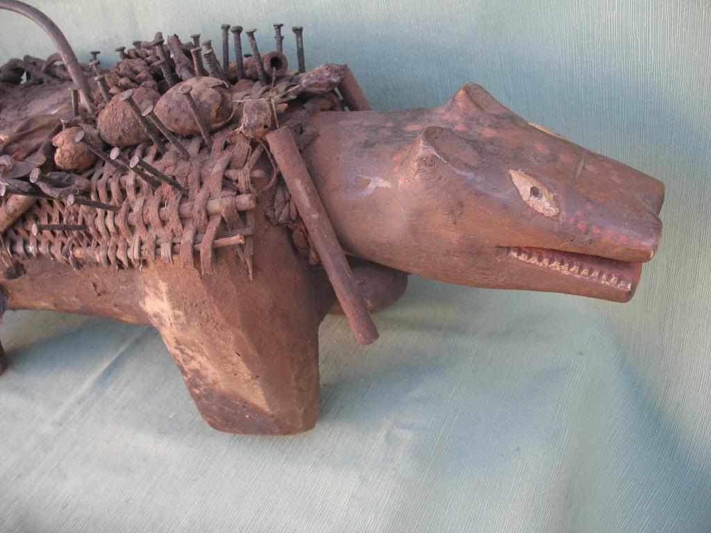 KOSSO: Es el nkissi kondi en forma de perro cubierto de clavos o de láminas de hierro. Gracias a su olfato puede perseguir y detectar a los hechiceros ndoki para que sean capturados y no puedan causar daños. Con frecuencia es representado con dos cabezas, una detecta las amenazas y la otra defiende a su propietario. El kosso es mediador entre el mundo de los vivos y el de los espíritus. Tiene además todas las propiedades de los nkissi kondi. Kosso de tamaño importante que conserva restos de libaciones rituales. Pátina antigua.
