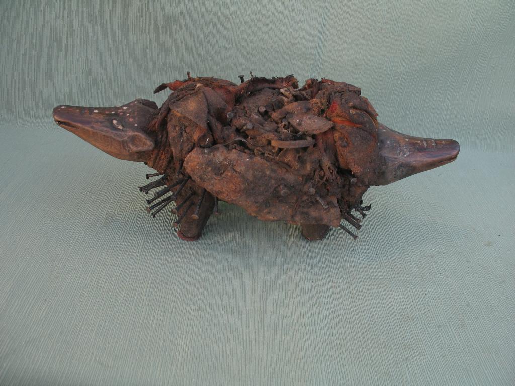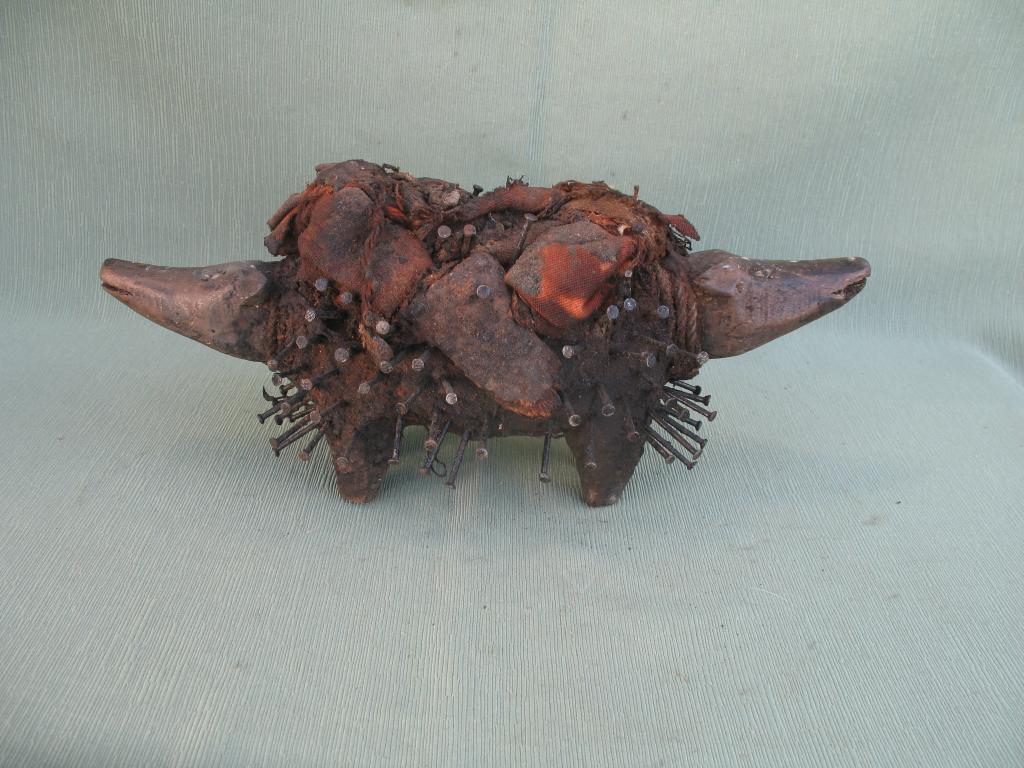 KOSSO: Es el nkissi kondi en forma de perro cubierto de clavos o de láminas de hierro. Gracias a su olfato puede perseguir y detectar a los hechiceros ndoki para que sean capturados y no puedan causar daños. Con frecuencia es representado con dos cabezas, una detecta las amenazas y la otra defiende a su propietario. El kosso es mediador entre el mundo de los vivos y el de los espíritus. Tiene además todas las propiedades de los nkissi kondi. Pátina antigua.