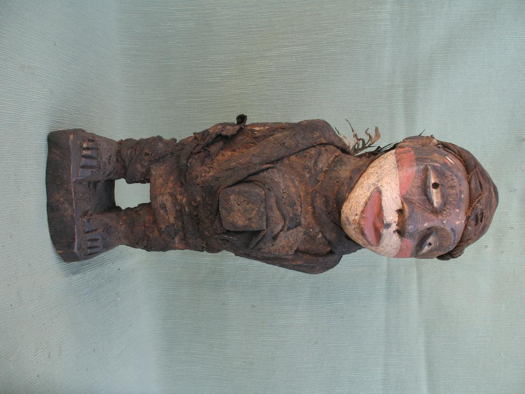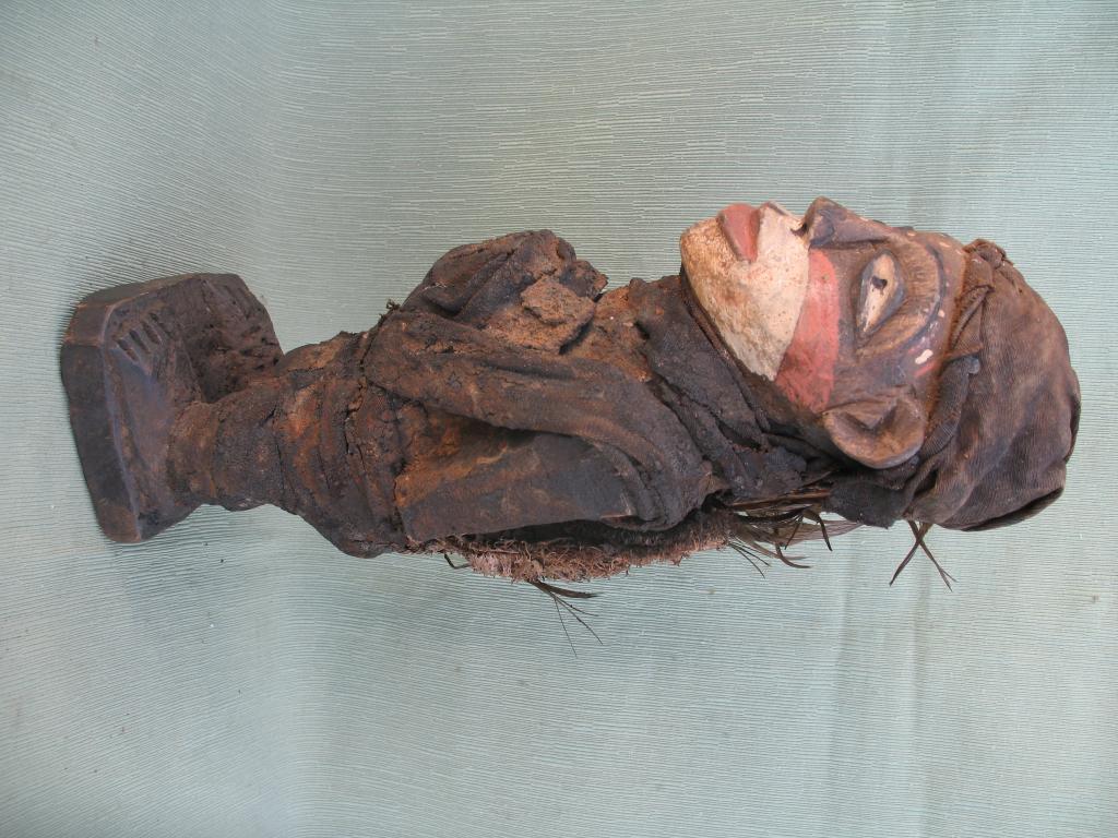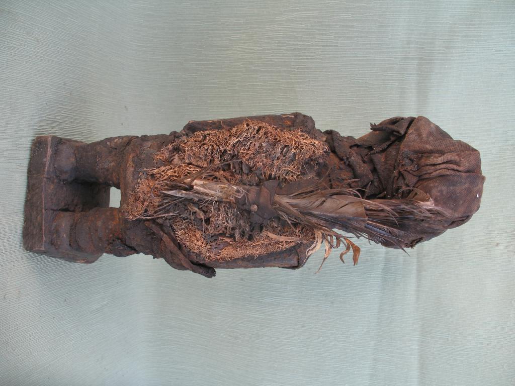 Materiales / Técnica : Madera, trapos, fibras vegetales, plumas, bilongo y pigmentos.