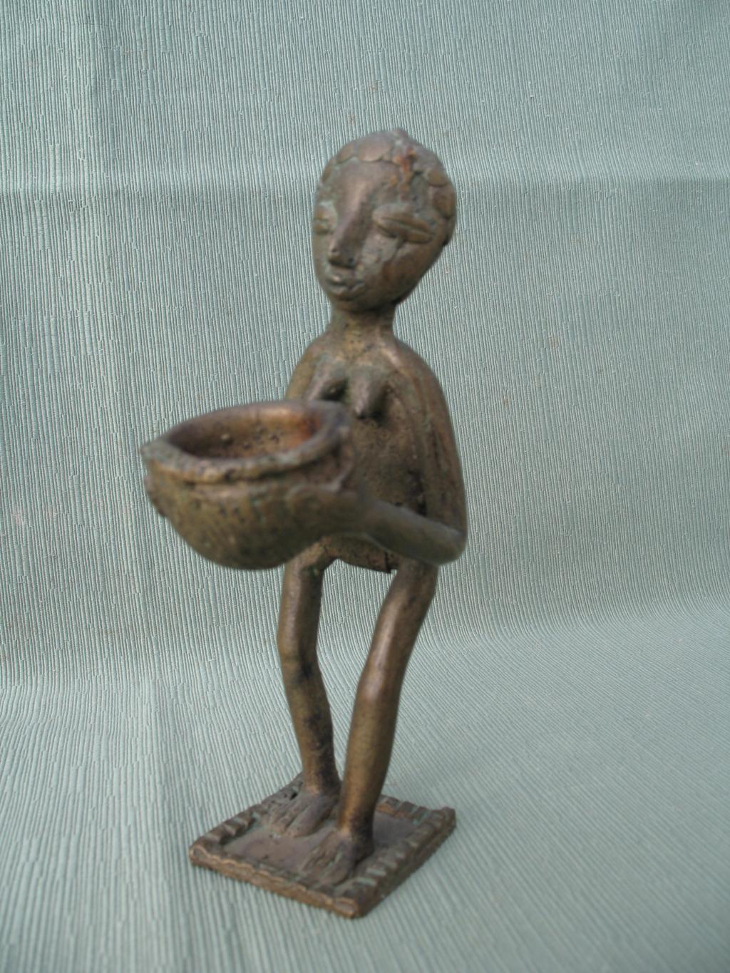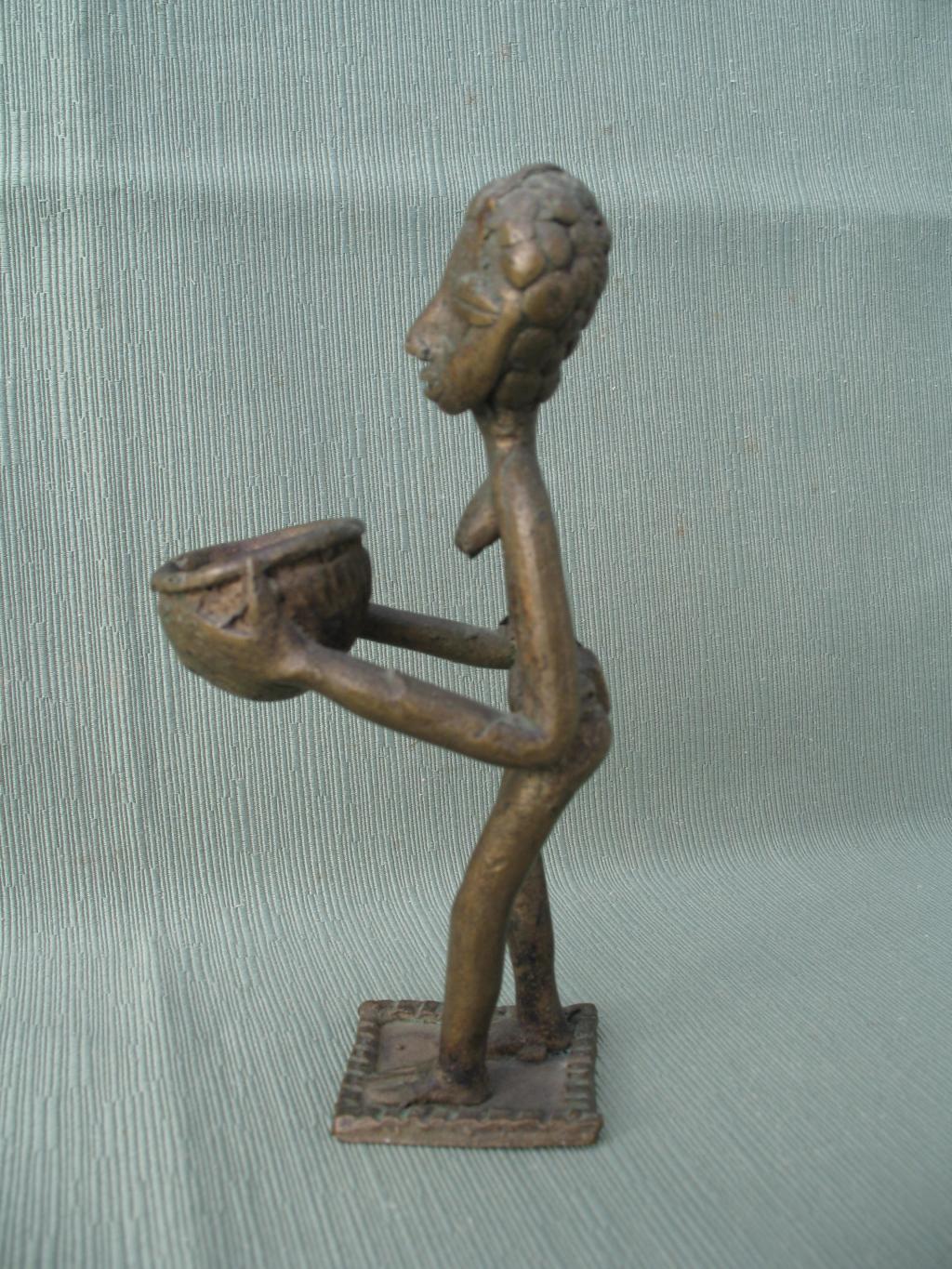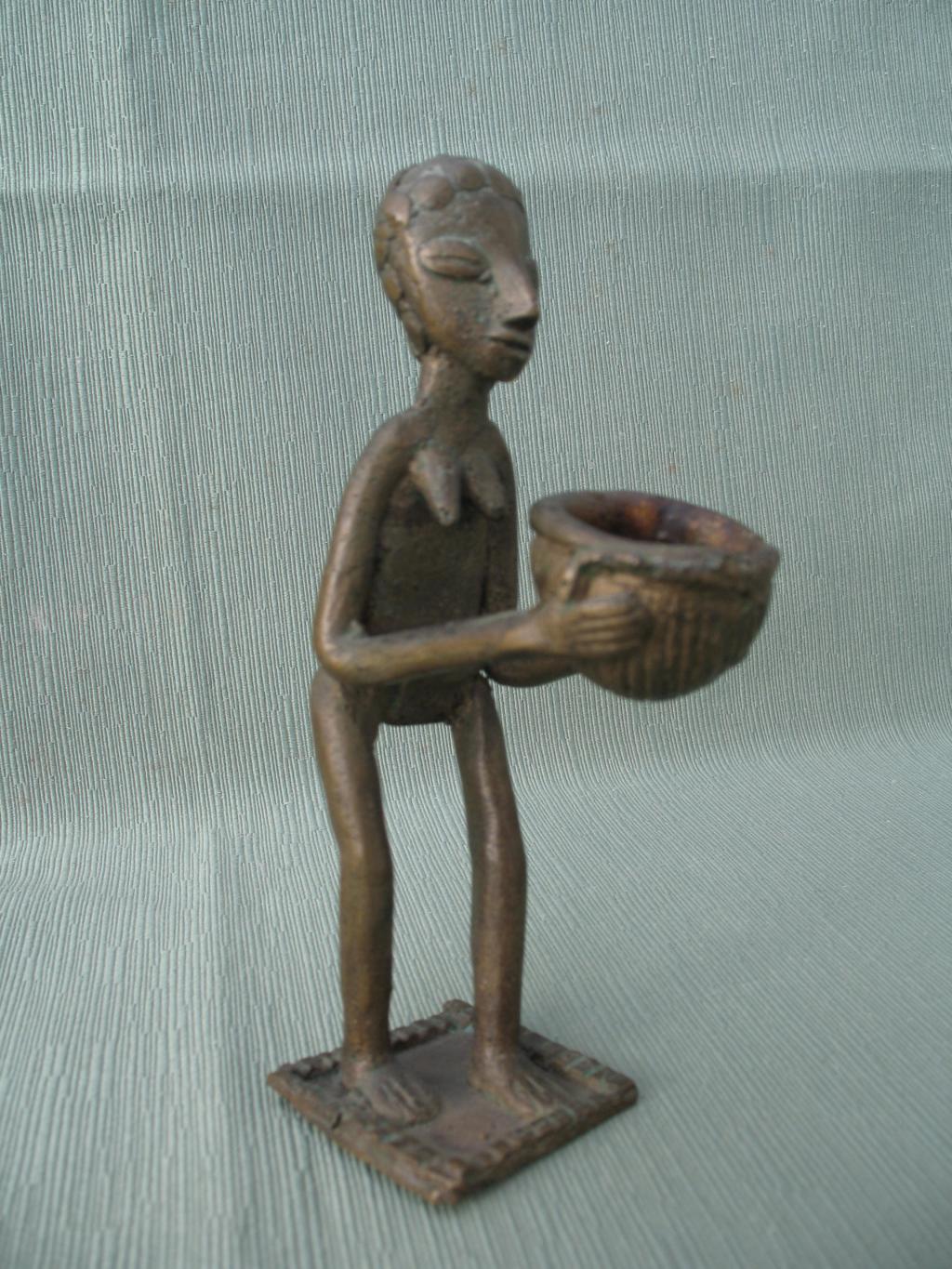 Figurilla adquirida en Abiyán a mediados de la década de los sesenta del siglo pasado. Representa a una mujer con un cuenco de los utilizados habitualmente para vpreparar la comida. Estas figuras se utilizaban como pesas de pesar el oro y servían en ocasiones como moneda de trueque. Engrosaban el patrimonio material de la familia. Pátina del tiempo.