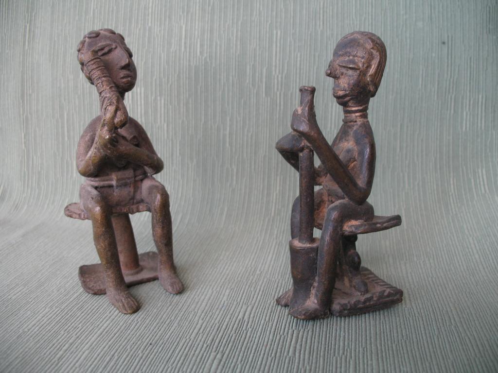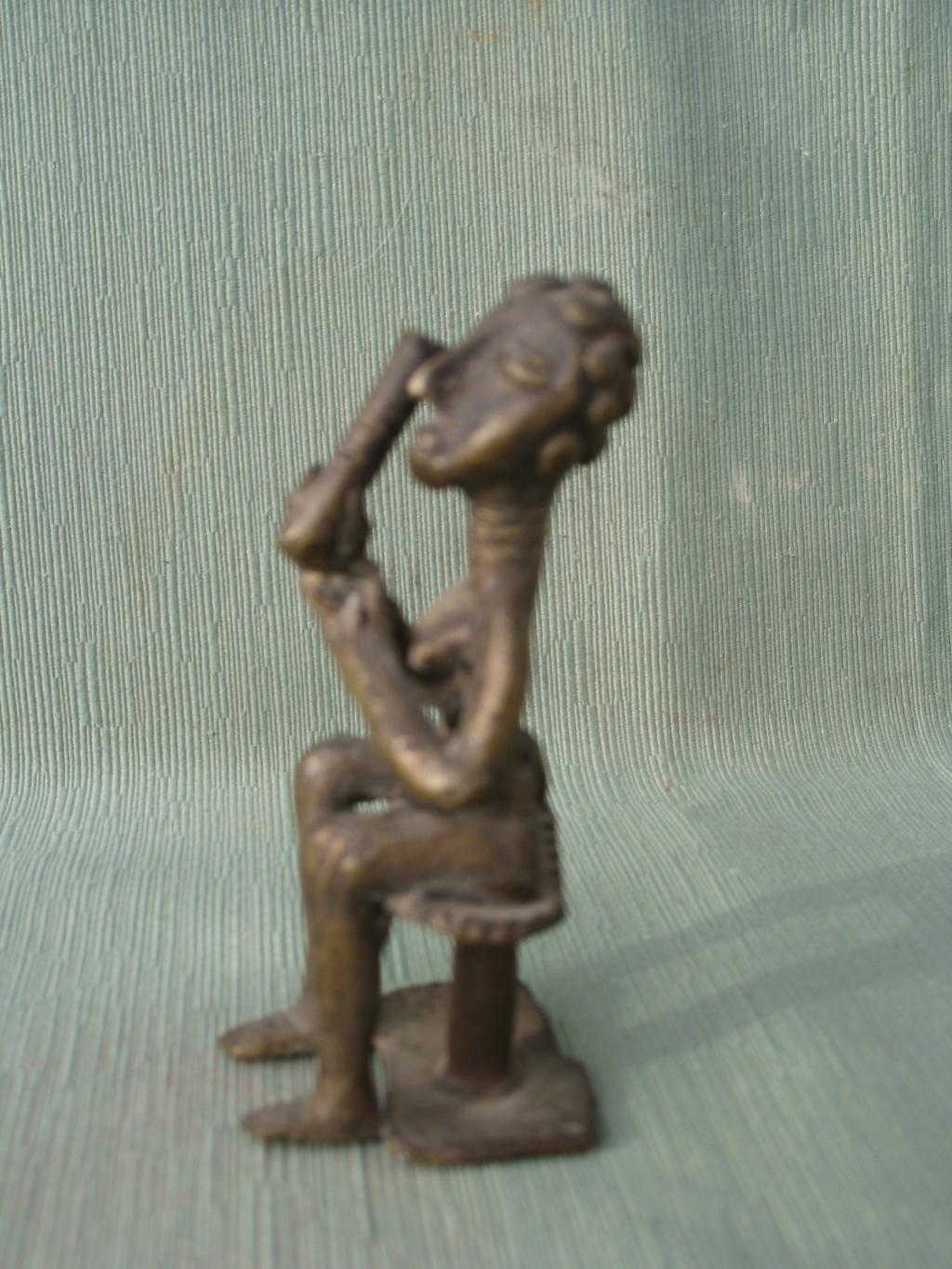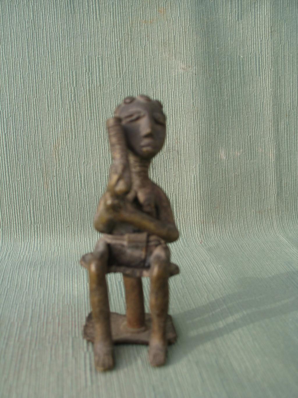 Pieza adquirida en Abiyán a mediados de los años sesenta del pasado siglo. Es una mujer agni sentada en un taburete akan, por lo tanto una mujer notable. Su cuello anillado y su tocado son característicos de la mujer agni. Lleva un cubresexo sujero con un cinturón de doble vuelta. Su expresión es de gran dulzura. Parece estar acariciando su rostro con el objeto que lleva en su mano derecha, cuyo significado desconocemos; es cilíndrico y anillado, redondeado en la base y cortado a ras en la paarte superior. Pátina del tiempo.