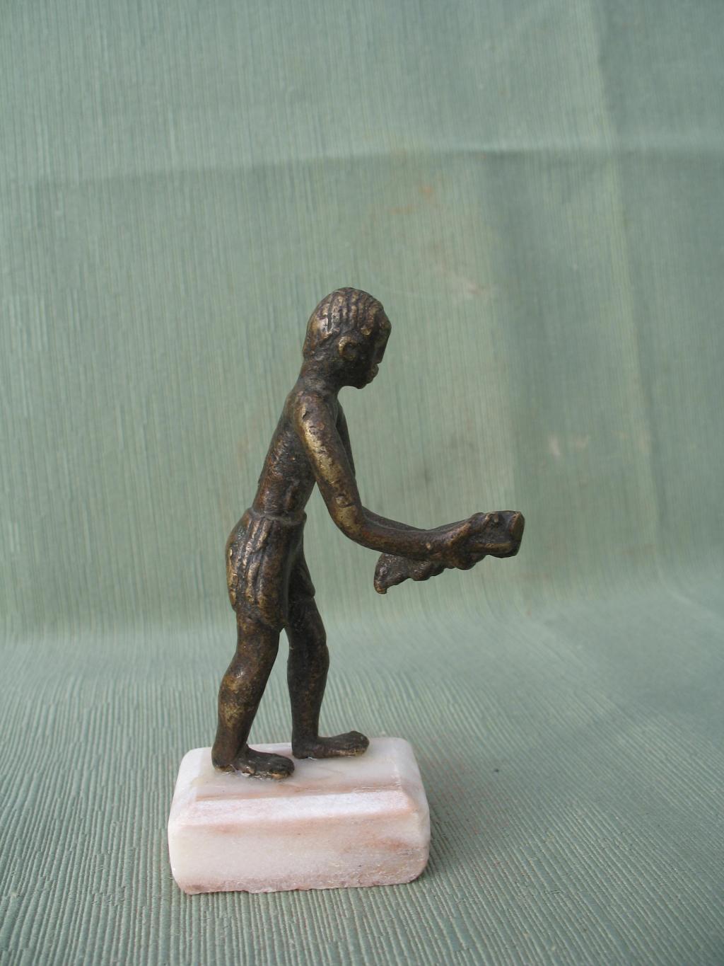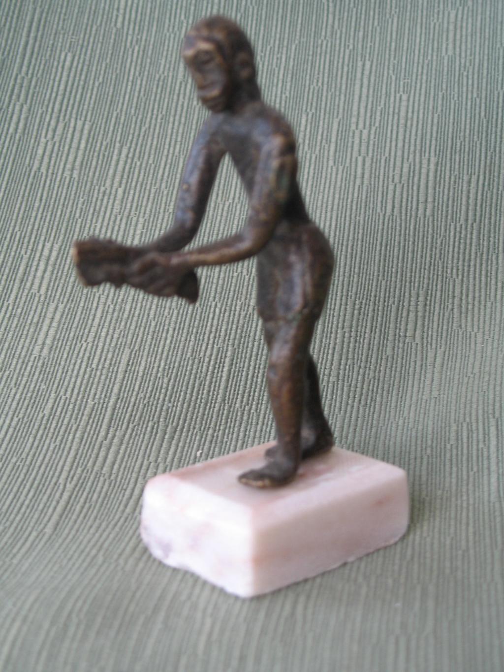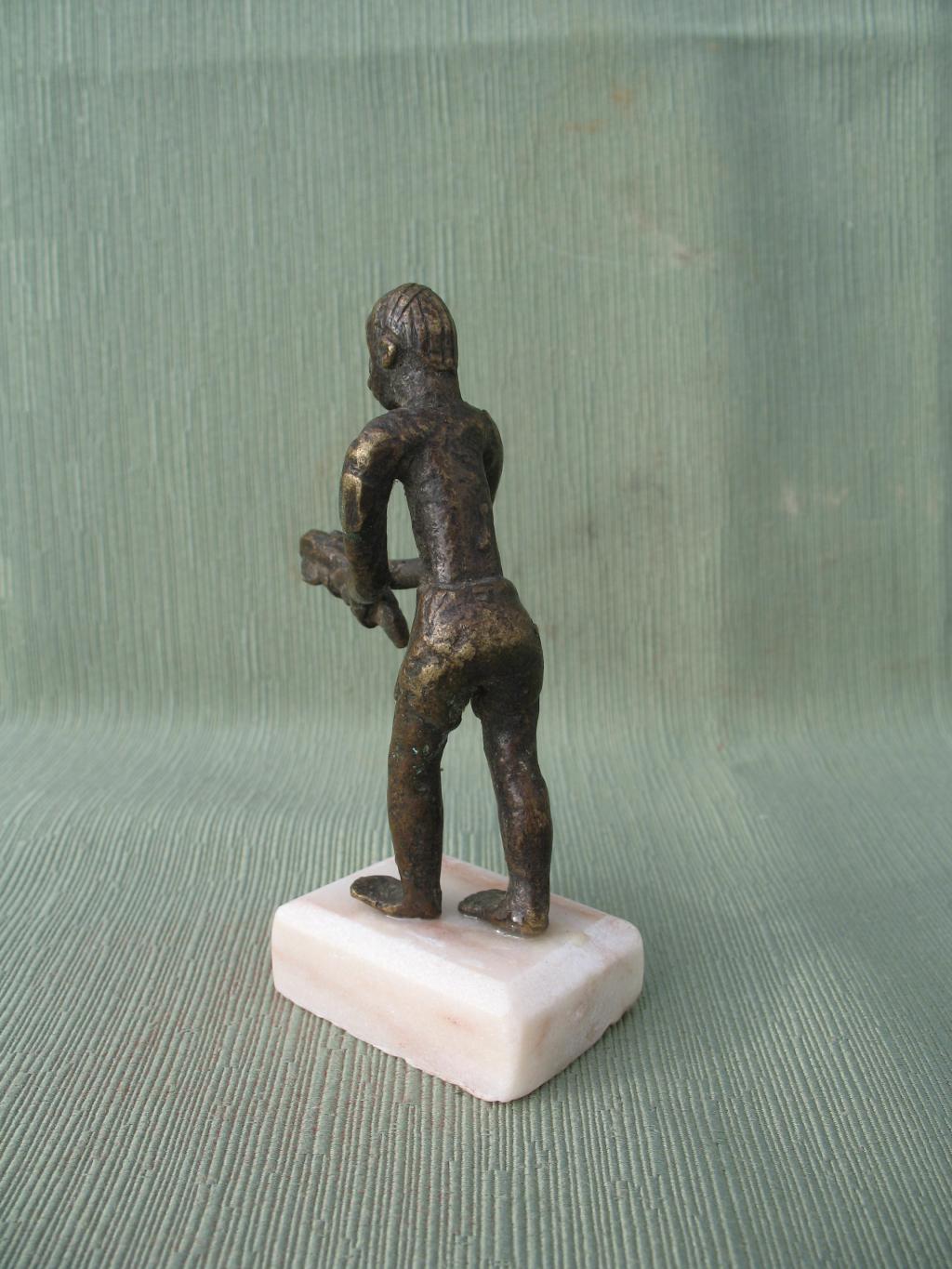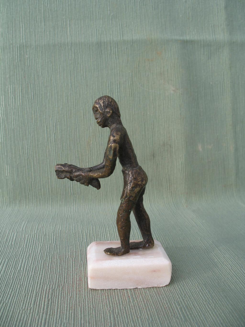 Figura de un hombre echado hacia adelante con un objetoen las manos cuyo significado desconocemos. Lleva un pantalón corto, al estilo de las estatuas de colonos. Pátina oscura.