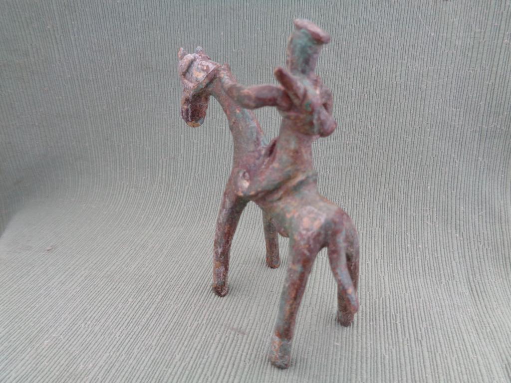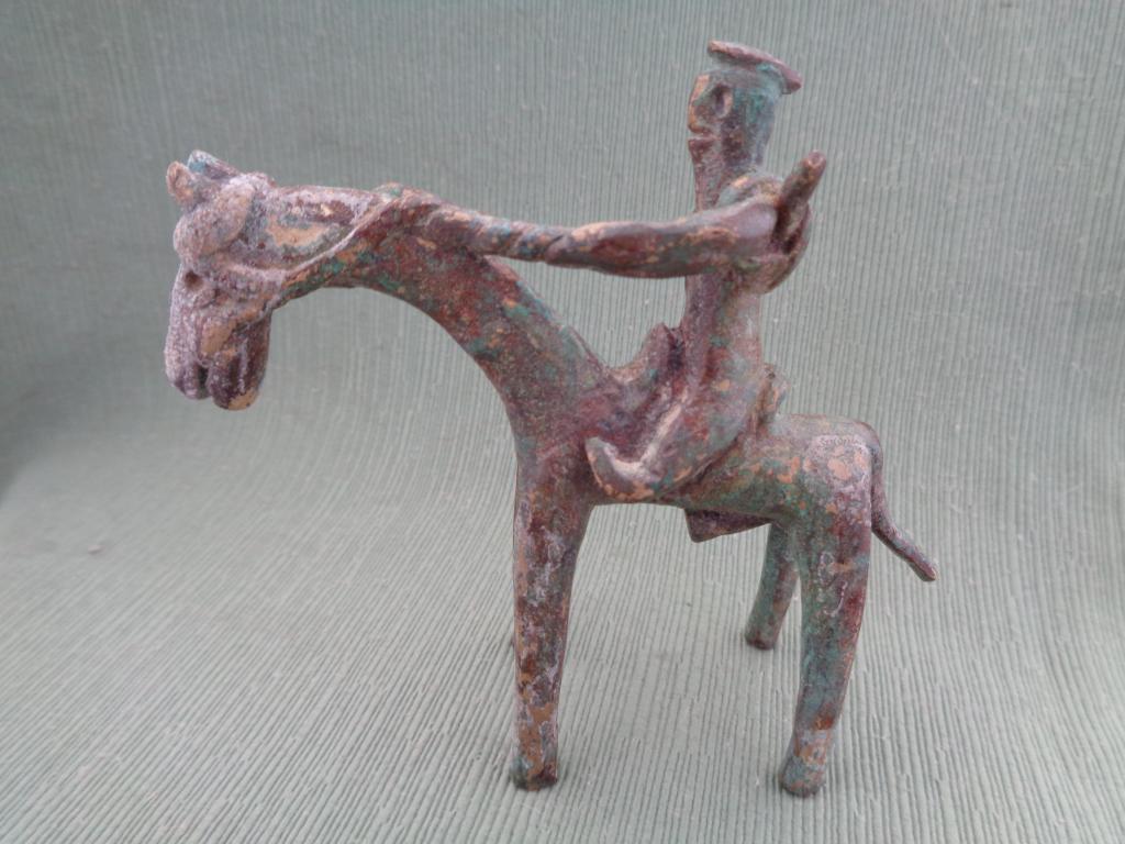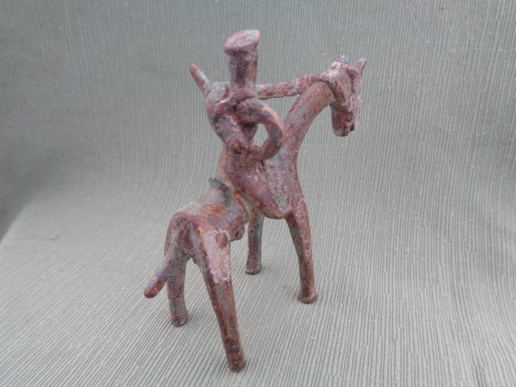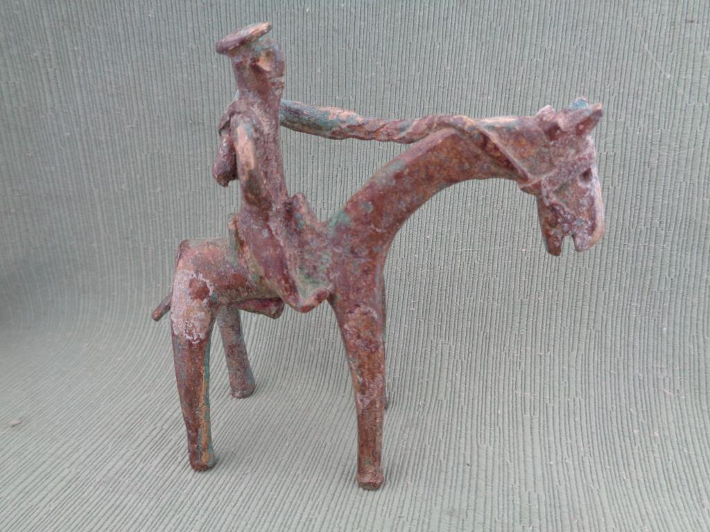 Pequeña figura que representa un caballero targui (singular de tuareg) en su montura. El jinete a la espalda lo que podría ser un carcaj. Pátina verdosa antigua.