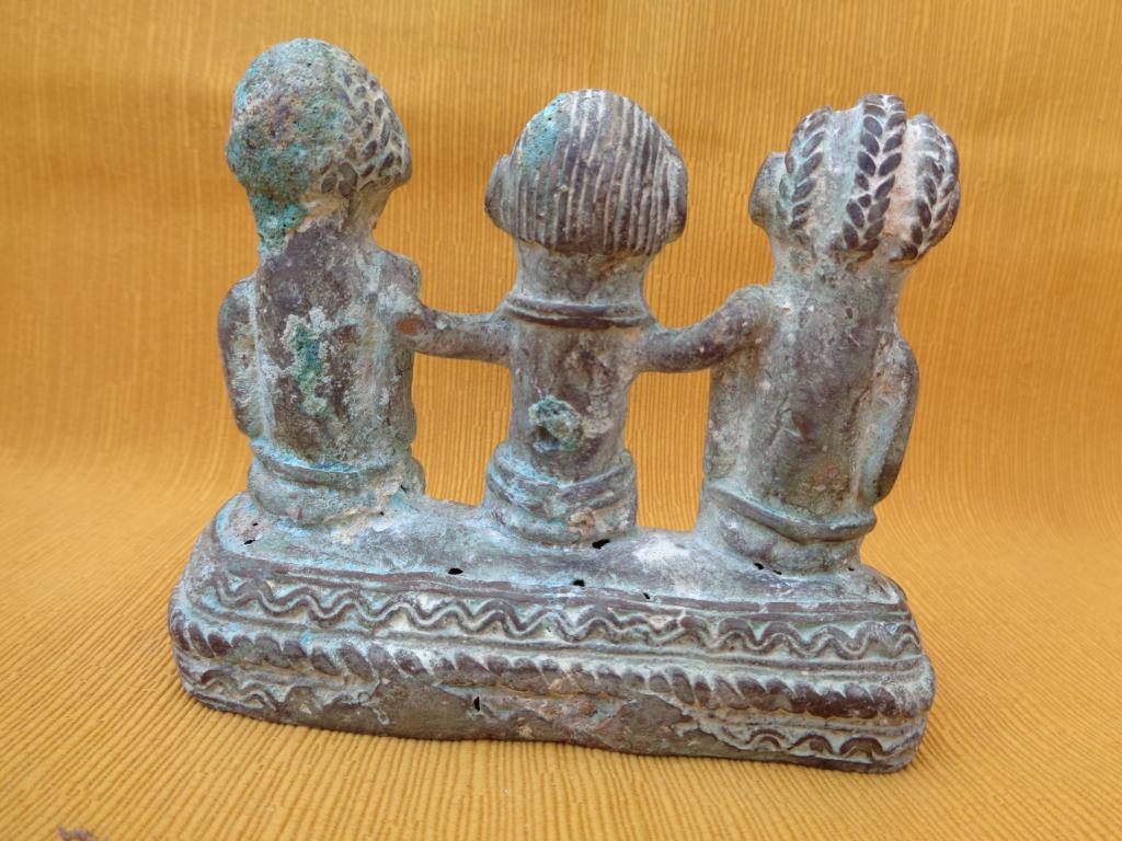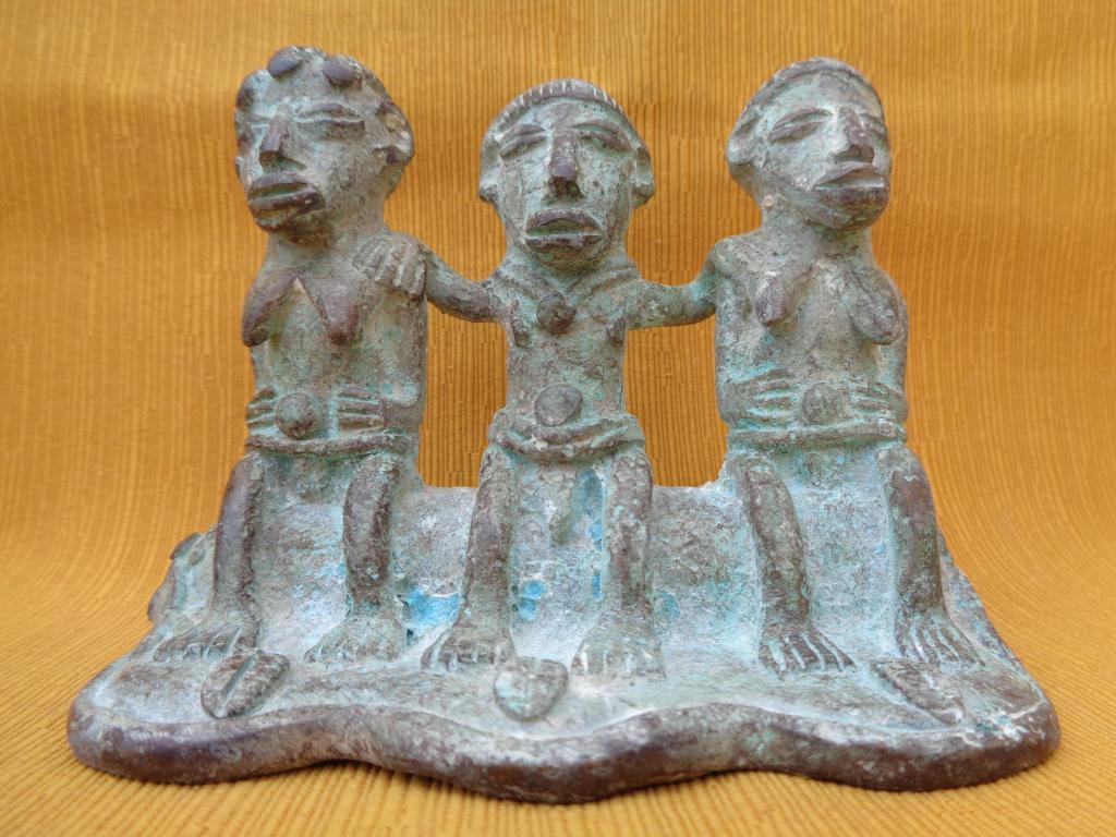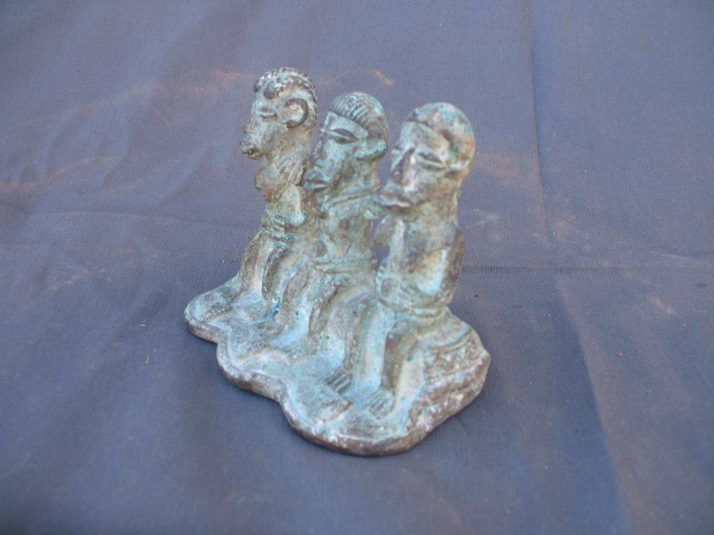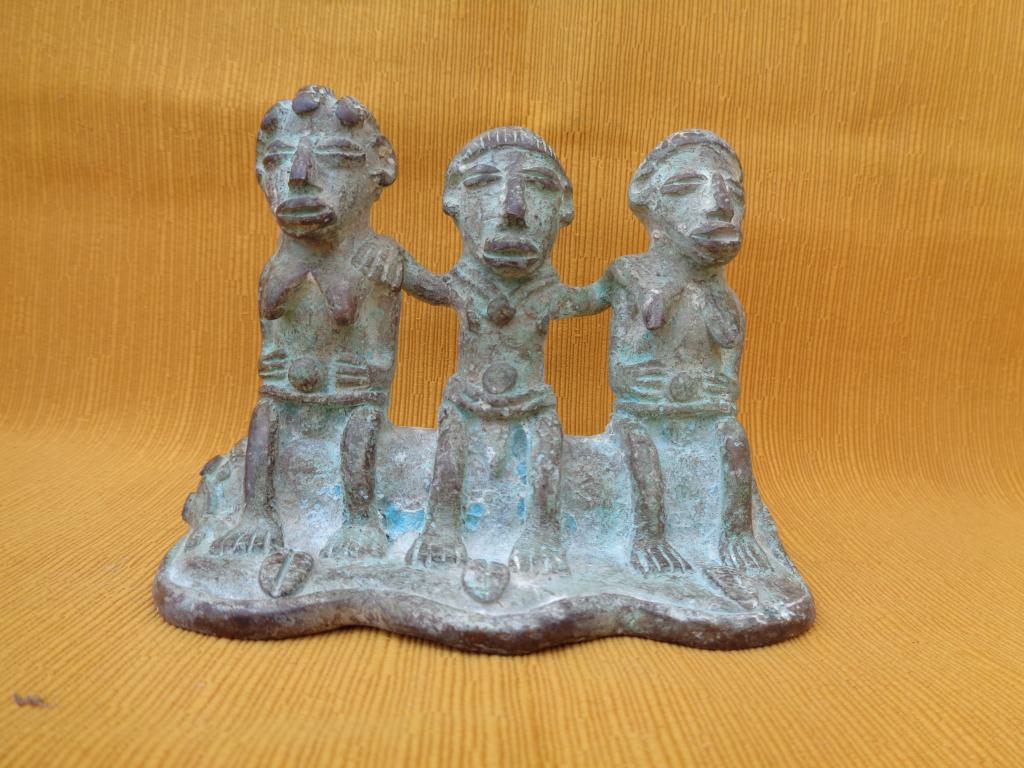 Antigua pieza encontrada en una excavación hace varias decenas de años. Representa al monarca o jefe de los Gan rodeado de sus esposas. Ambas llevan un peinado distinto. El collar del monarca y el disco que llevan sobre el cinturón son símbolos de la realiza. El cinturón del monarca es doble. Sus esposas rodean el disco con las manos. Resaltan los marcados rasgos del rostro. Los Gan son conocidoss por su expericiencia en el arte de la cera fundida.