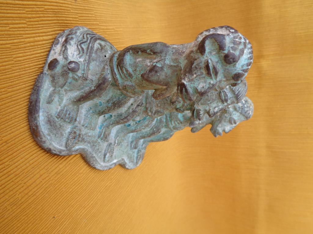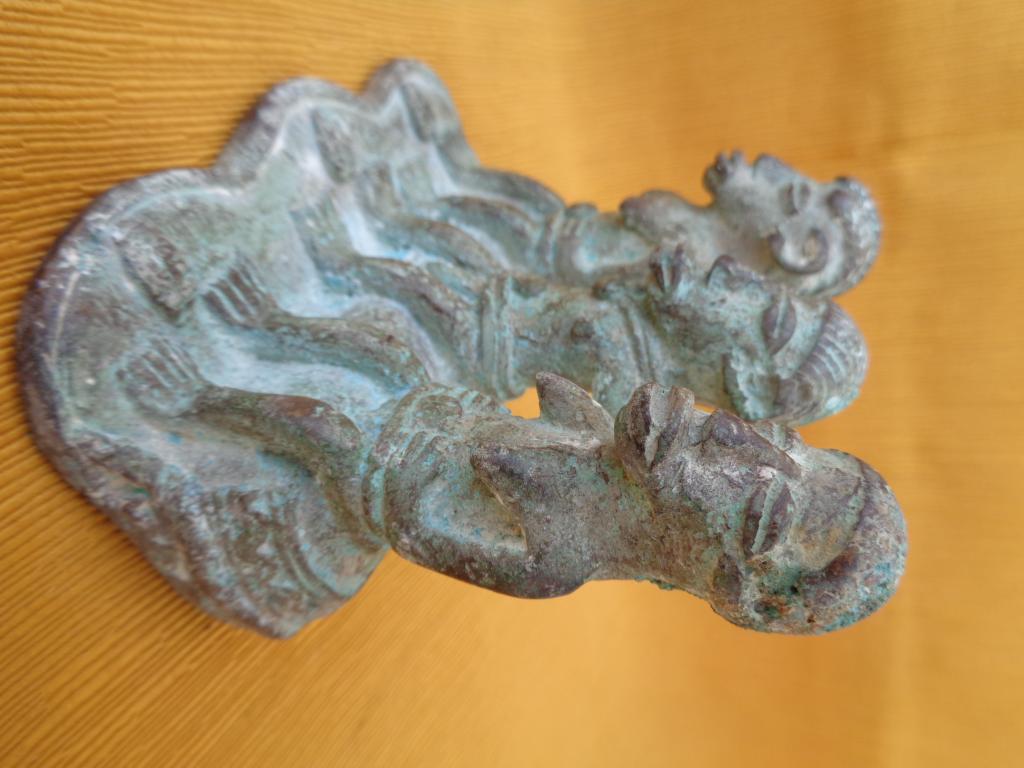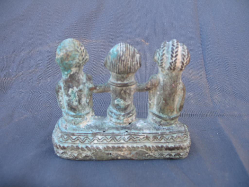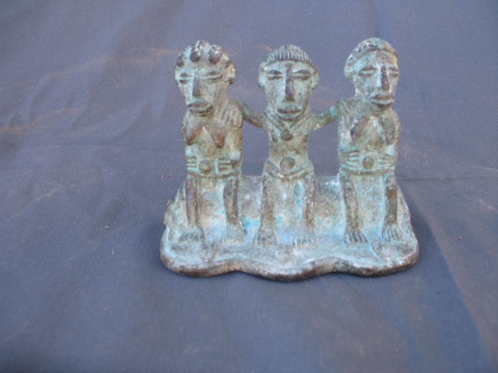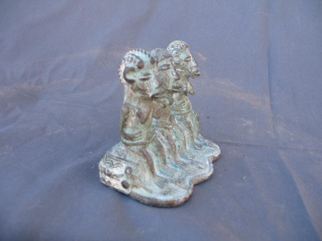 Antigua pieza encontrada en una excavación hace varias decenas de años. Representa al monarca o jefe de los Gan rodeado de sus esposas. Ambas llevan un peinado distinto. El collar del monarca y el disco que llevan sobre el cinturón son símbolos de la realiza. El cinturón del monarca es doble. Sus esposas rodean el disco con las manos. Resaltan los marcados rasgos del rostro. Los Gan son conocidoss por su expericiencia en el arte de la cera fundida.